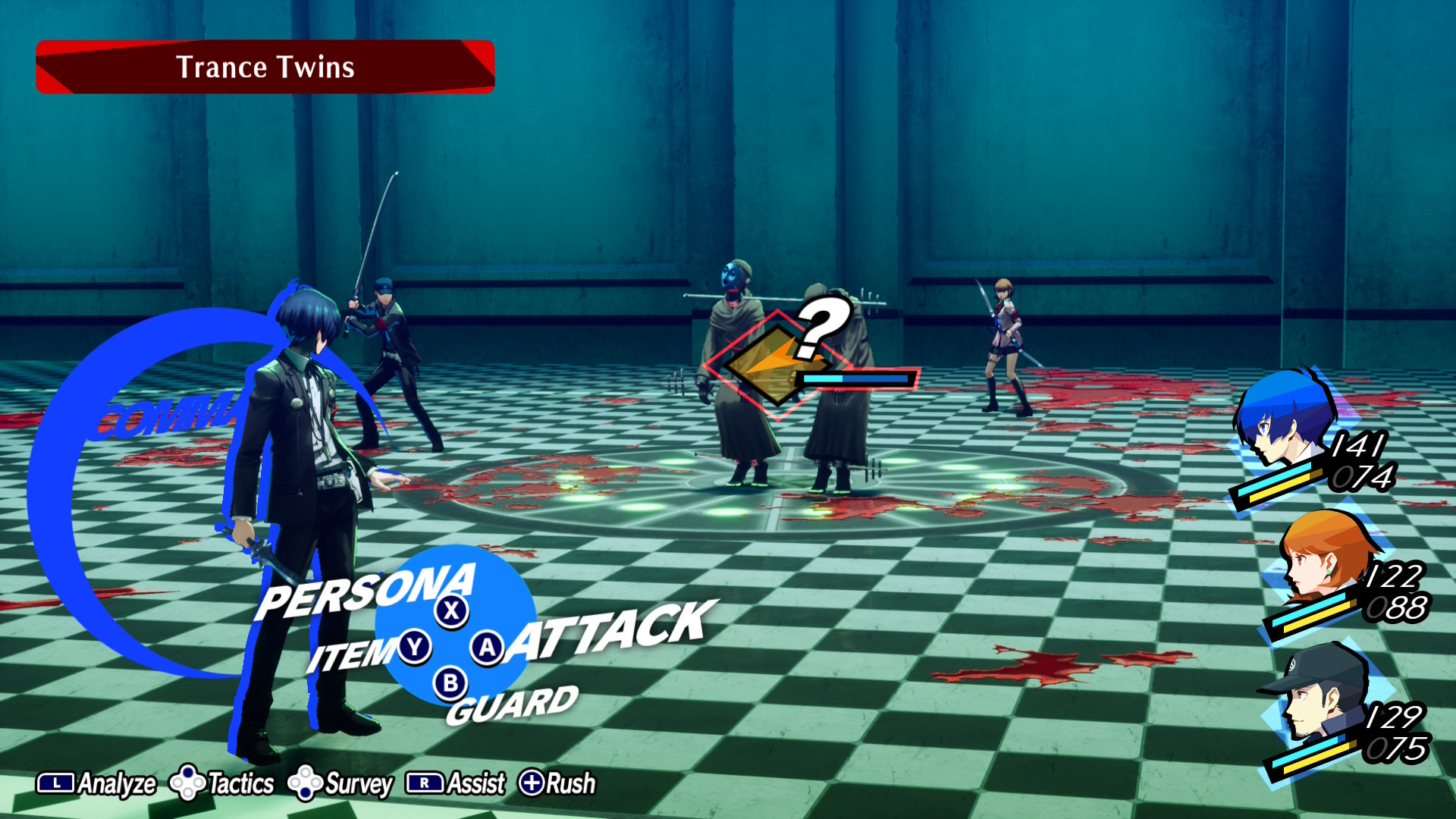 En dehors de l’énorme travail très réussi sur la partie graphique du jeu (chara-designs et modèles 3D largement rehaussés, remise à niveau de l’interface bienvenue, et animations forcément revues avec une excellente qualité), le gameplay a connu d’autres mises à jour que la Théurgie : à la façon de Persona 5, il est par exemple possible d’enchaîner avec un autre membre d’équipe en cas de coup critique ou de faiblesse exploitée, avec un assaut général à la clé si tous les ennemis sont KO. Ici, comme dans Persona 3: Portable, il est possible de contrôler les actions de tous les personnages de l’équipe (ce qui n’était pas possible dans le jeu originel). Le tirage de cartes a aussi été corrigé, en laissant la possibilité de choisir soi-même la carte voulue, ce qui est clairement bienvenu quand on ne veut pas tirer certaines cartes parfois bien inutiles, surtout au niveau des atouts du Tarot…