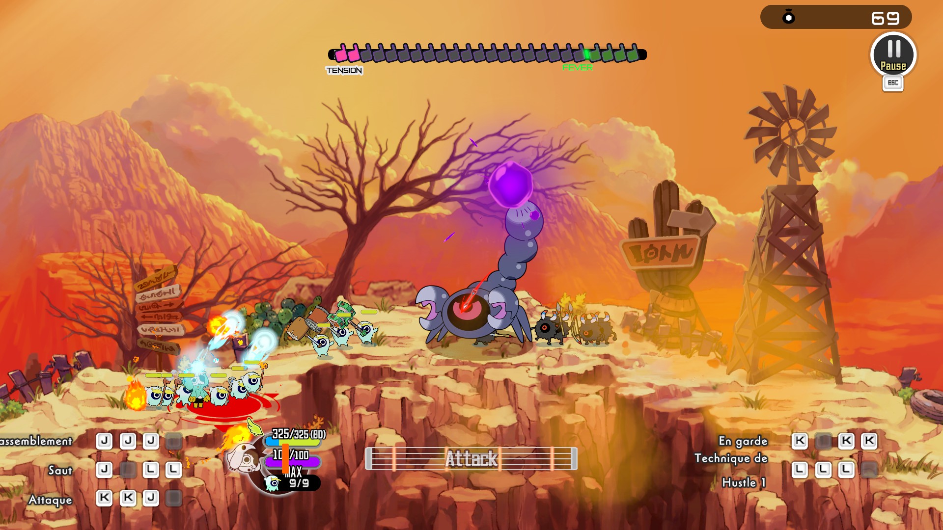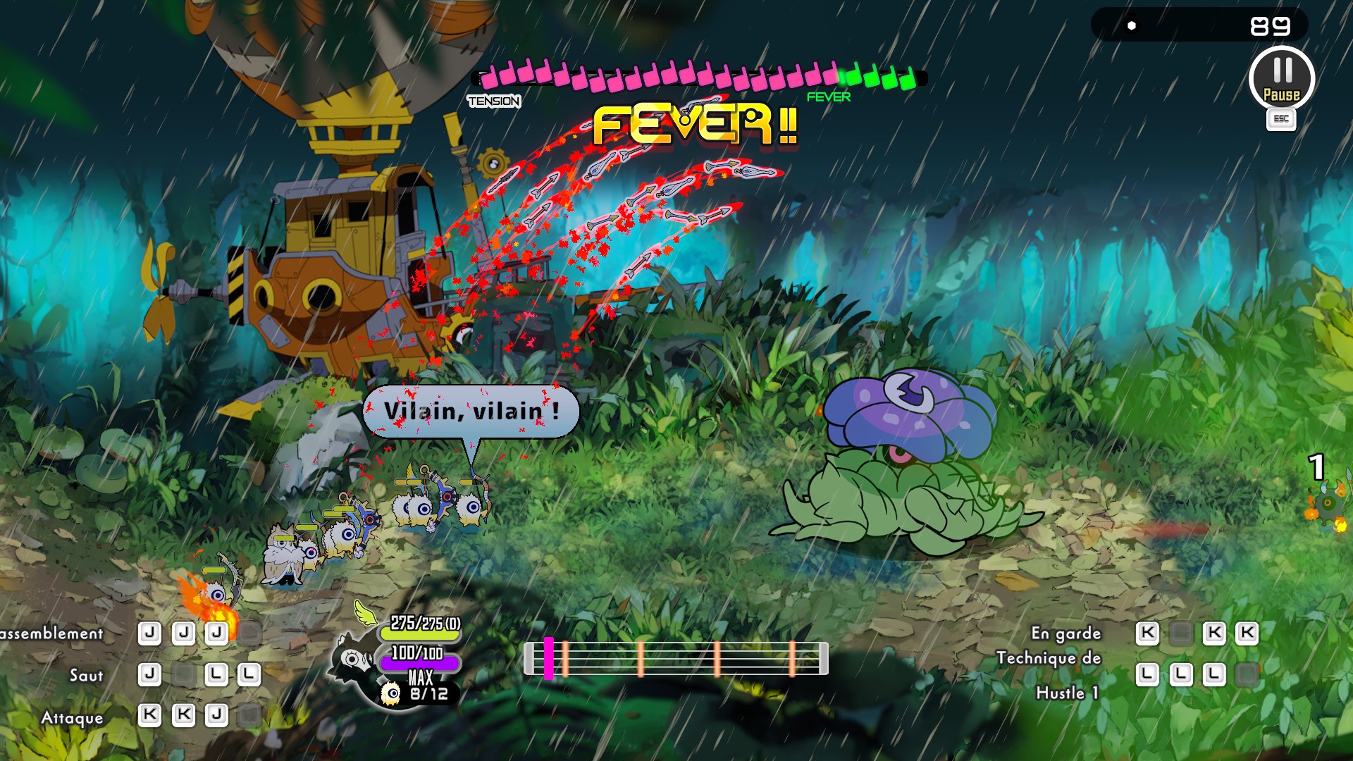 Pour donner des ordres à cette mini-armée, cela se passe en rythme avec la musique. En bas de l'écran se trouve une partition flanquée de trois marqueurs et un curseur qui passe régulièrement dessus avec un timing très précis. Il faut donc appuyer sur les boutons au bon moment et dans un ordre précis afin de demander aux soldats d'agir.