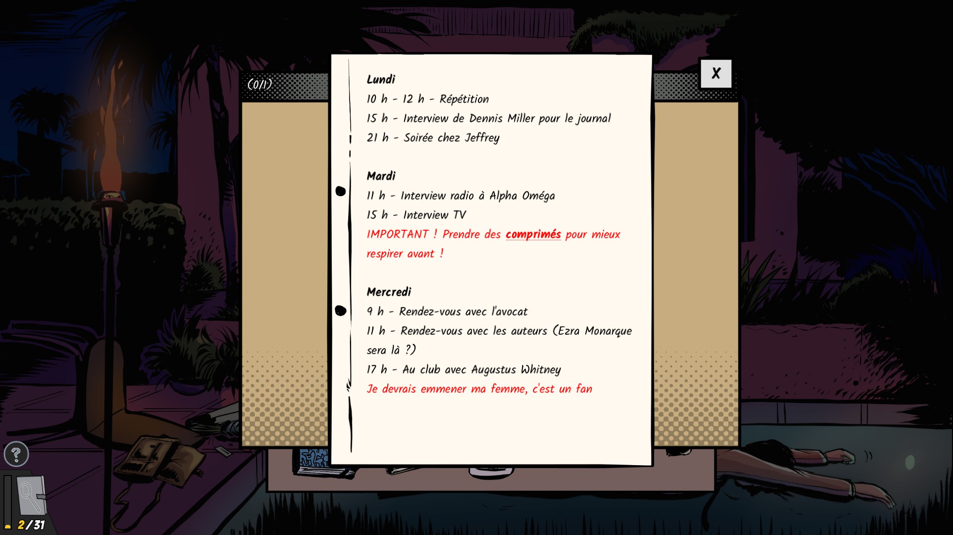 Un accident de voiture qui n'est peut-être pas si accidentel. Une noyade lors d'une soirée du tout Hollywood. Voilà les deux enquêtes qui attendent le joueur dans cette démo de Confidential Killings. Un jeu dont le but est de collecter les mots (littéralement) qui vous permettront de boucler votre rapport et de passer à l'affaire suivante. Observation, étude des indices et collecte d'information sont la clé, avec un peu de méthode pour ne pas être noyer sous les noms des personnes impliquées. C'est assez original et sympa, même si recommande plutôt la démo en anglais. Le français est disponible mais la traduction trébuche parfois.
