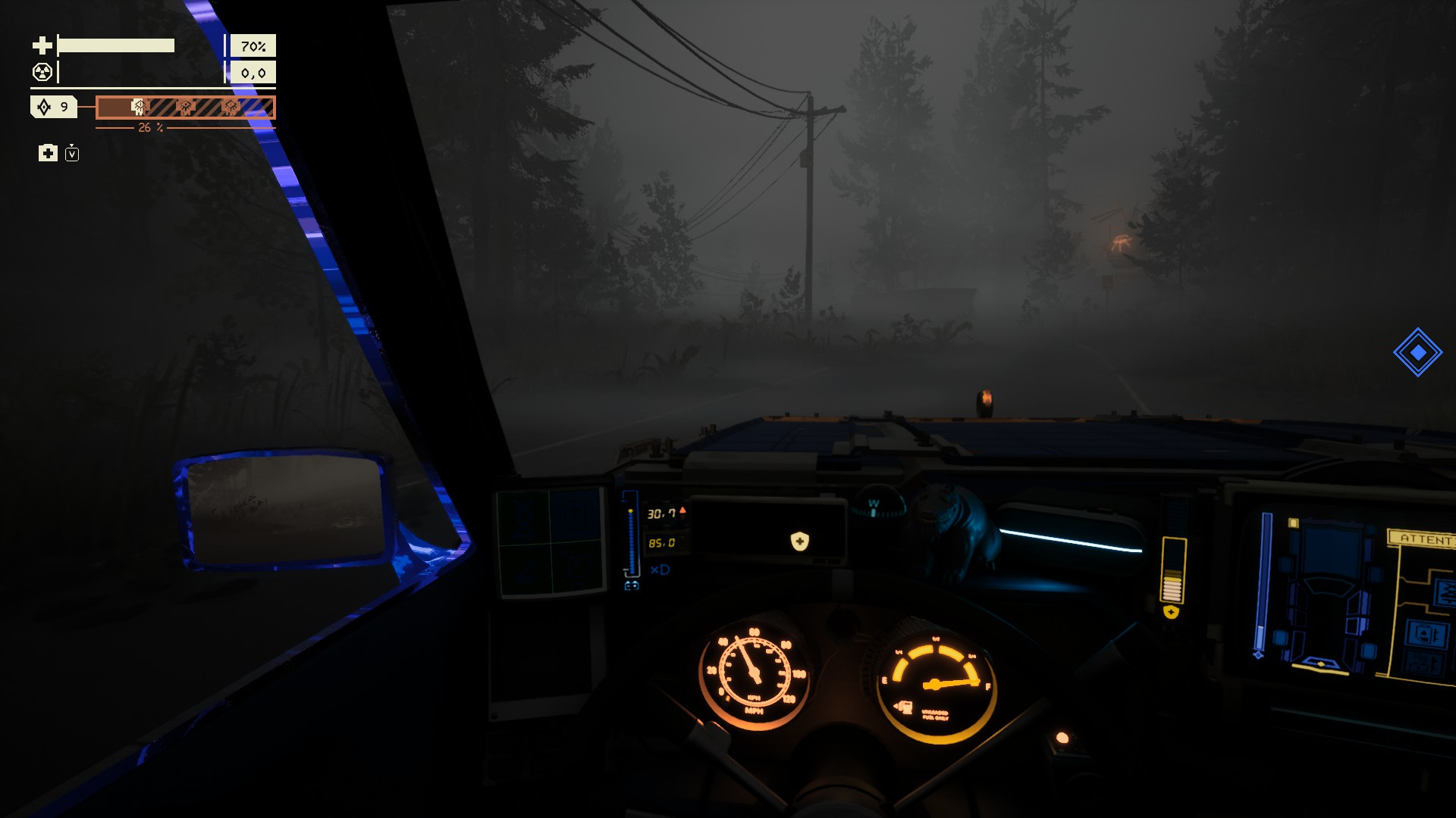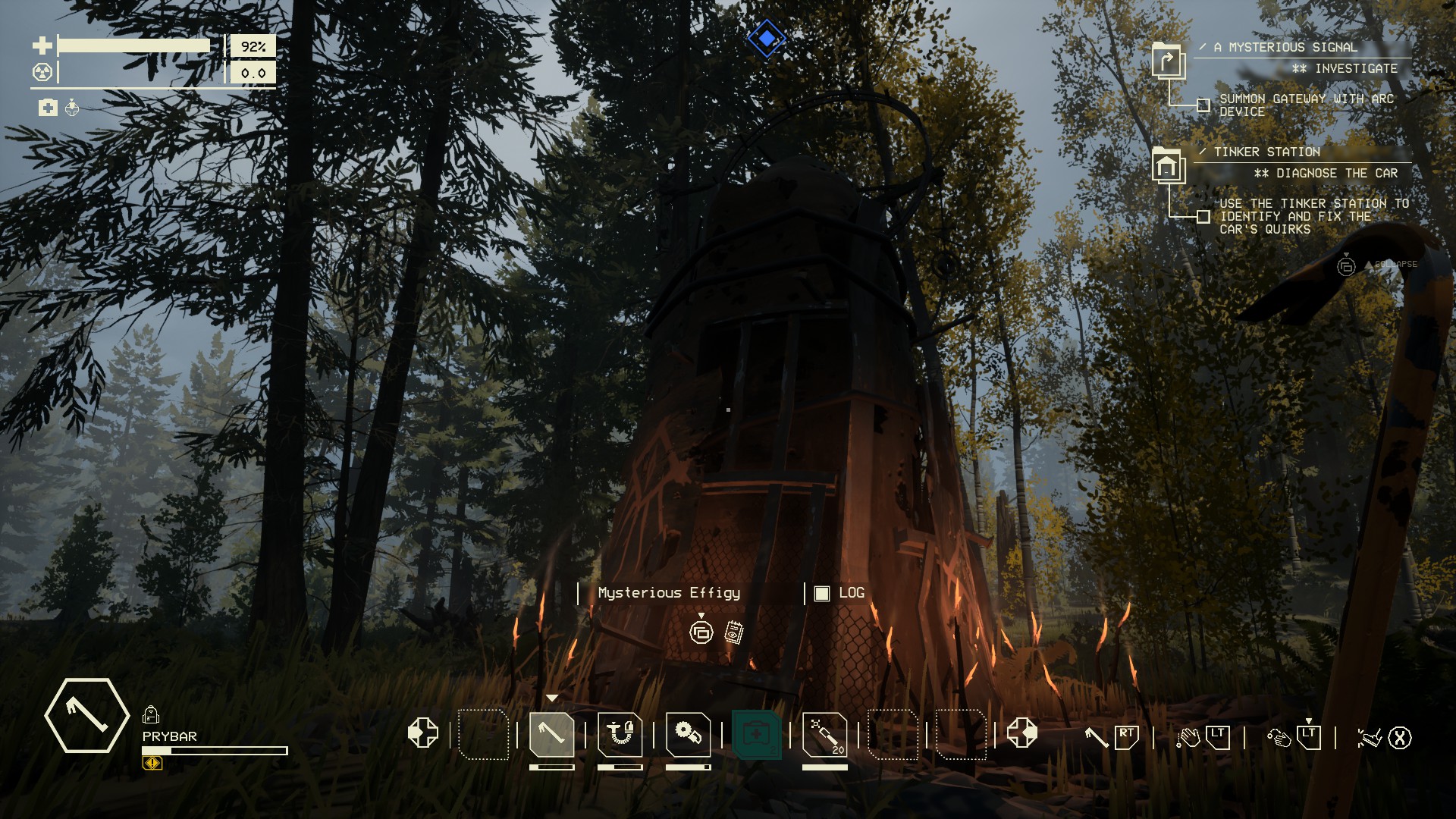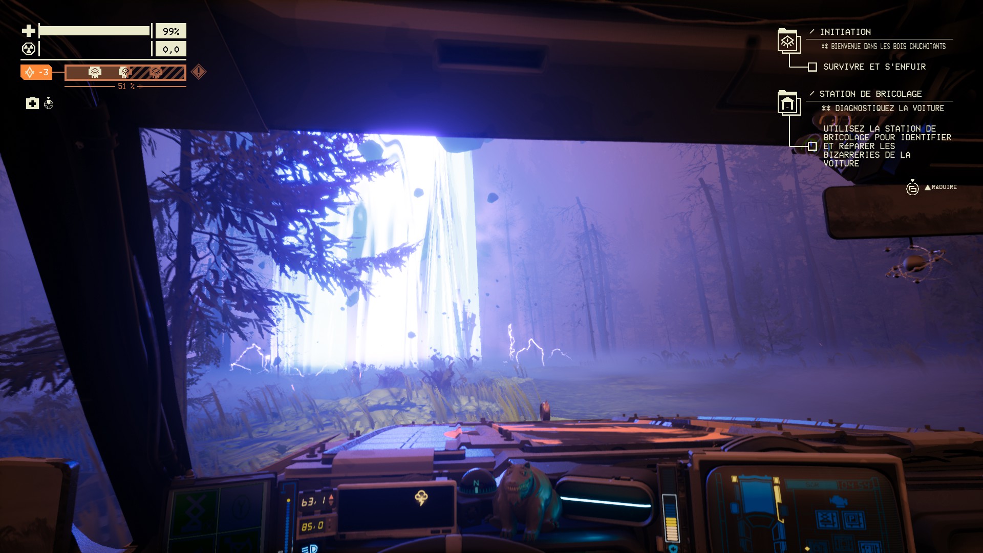 Au début du trajet, on est mis en confiance, on prends le temps de fouiller les cabanes, on vampirise les épaves pour recharger la voiture en énergie. Il y a quand même quelques petits bruits inquiétants, une ombre qui s'évapore à la limite de la vision, une créature inquiétante qui ne semble pas vous avoir encore remarqué. Parfois, le son de la radio devient distordu et on se surprend à regarder frénétiquement autour. Et soudain, après un arrêt près d'un camion de transport, la voiture ne démarre plus ; pas assez de ressource pour réparer, donc on part en courant vers les habitations les plus proches. Au détour d'un abri de pique-nique, on tombe sur un objet providentiel : un coup de racloir et on obtient enfin le graal tant espéré. De retour à fond vers la voiture, on esquive une bestiole étrange qui rebondit dans son coin. Arrivé au véhicule, bricolage et le moteur redémarre enfin. Sauf qu'une créature de la Vague s'est entre temps lancée en chasse, sa masse noire est visible dans le rétroviseur. Il est temps d'aller sacrifier les artéfacts, on manque de prudence sur le chemin. On soupire en voyant une bestiole s'enfuir avec l'une de nos portes, on panique quand l'engin dévale la pente en tonneau. On arrive à l'autel, le monstre à nos trousses. Le portail est ouvert, on trépigne en attendant que la récompense se matérialise. La sortie est là-haut, au sommet de ce flanc rocheux sillonné par une route en lacets. Et on finit par foncer désespérément dans le tumulte, à essayer de faire tenir la voiture suffisamment de temps pour arriver au portail. Les alarmes hurlent et le tableau de bord ressemble à un sapin de noël. Des choses craquent, des débris roulent sur le parebrise. La colonne de lumière est là, juste derrière les arbres. Une procession de revenants est sur le chemin : contourner ou aller droit dedans ?