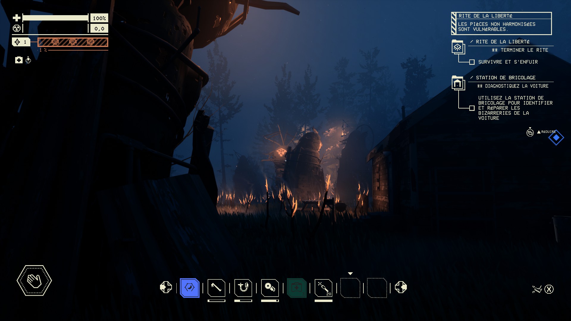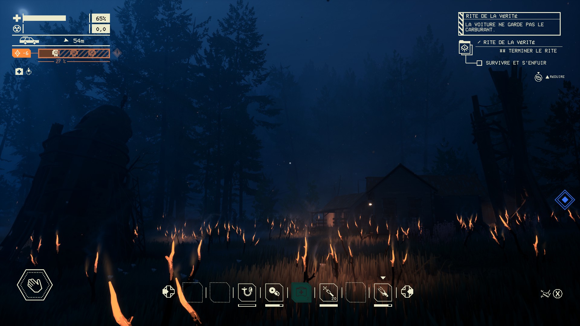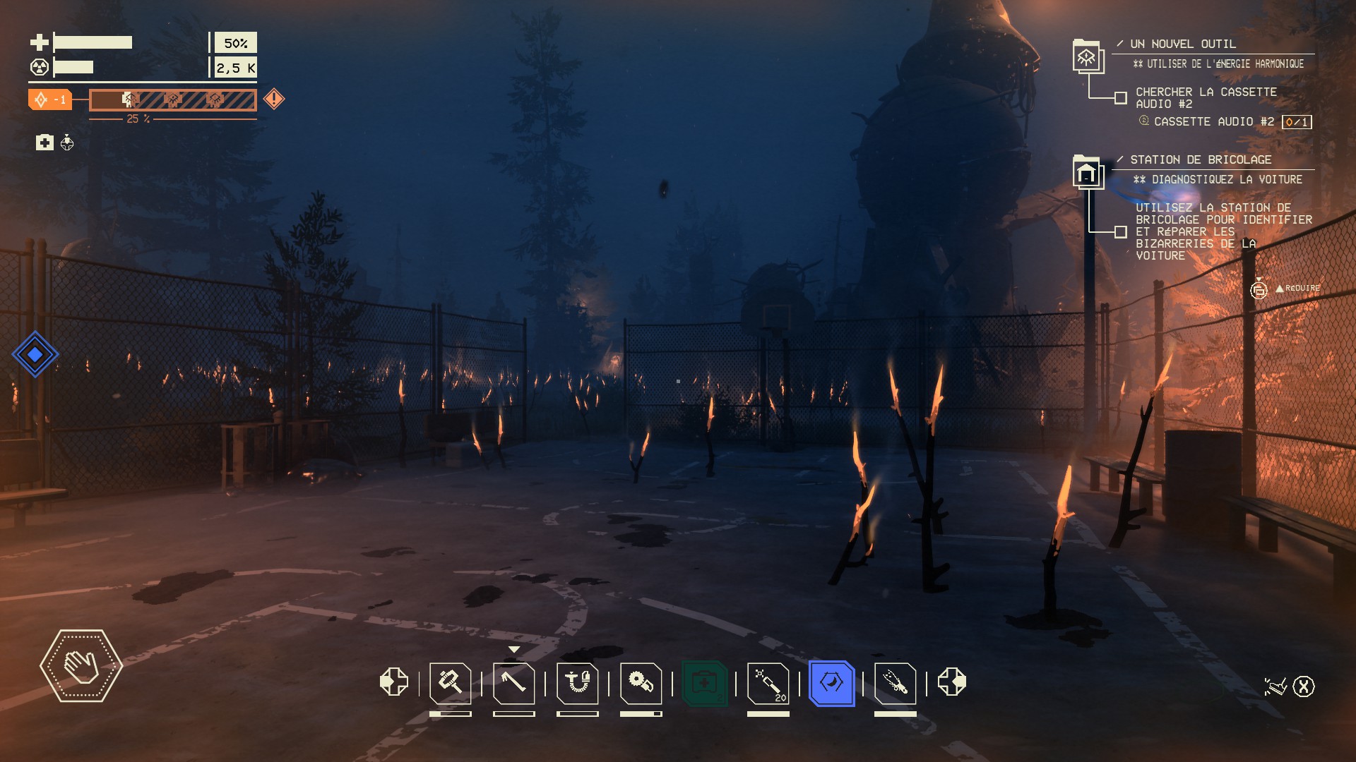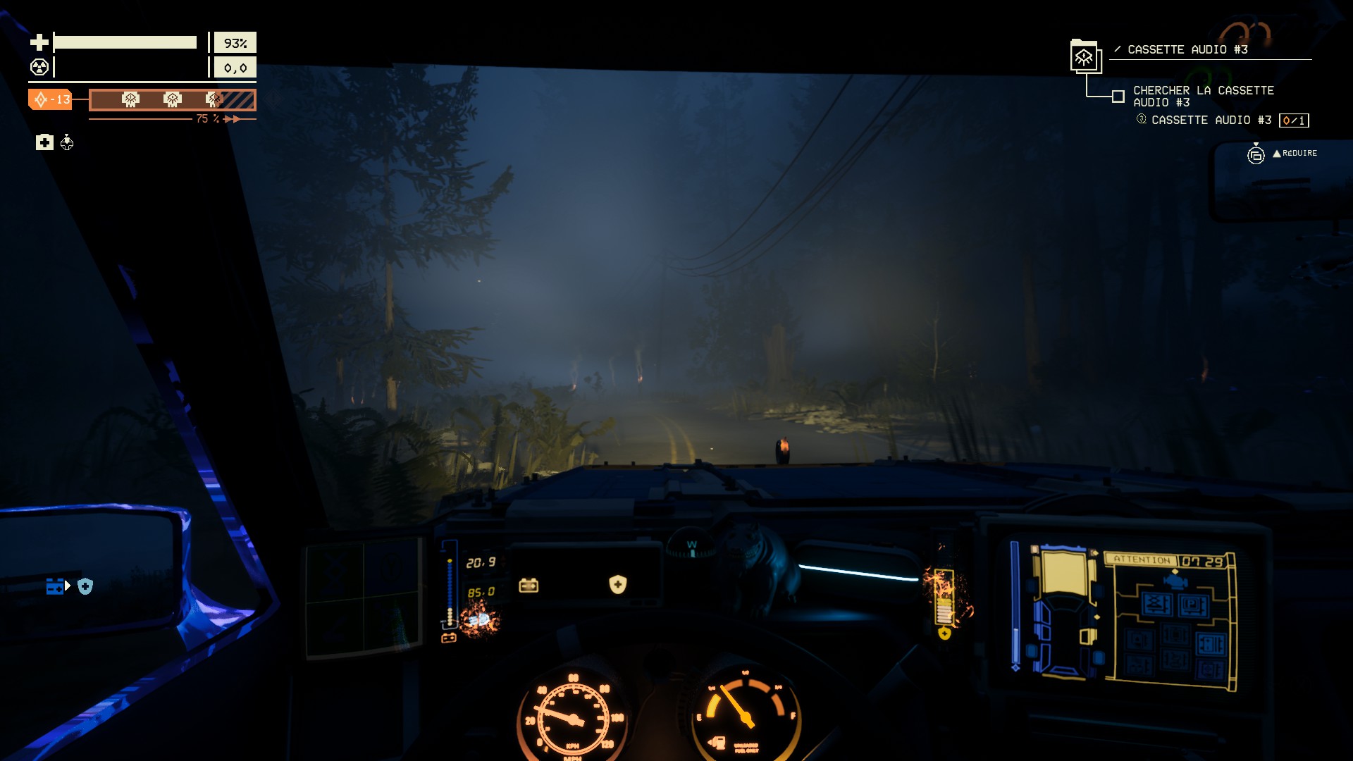 À la radio, un des personnages me propose de récupérer une amélioration pour le garage. La chose débloque l'accès aux expéditions, un nouveau mode de jeu introduit par la mise à jour de mars 2025. Le jeu promet que l'expérience peut s'avérer très dangereuse ; non, trop tôt, je n'ai plus mes réflexes d'antan.