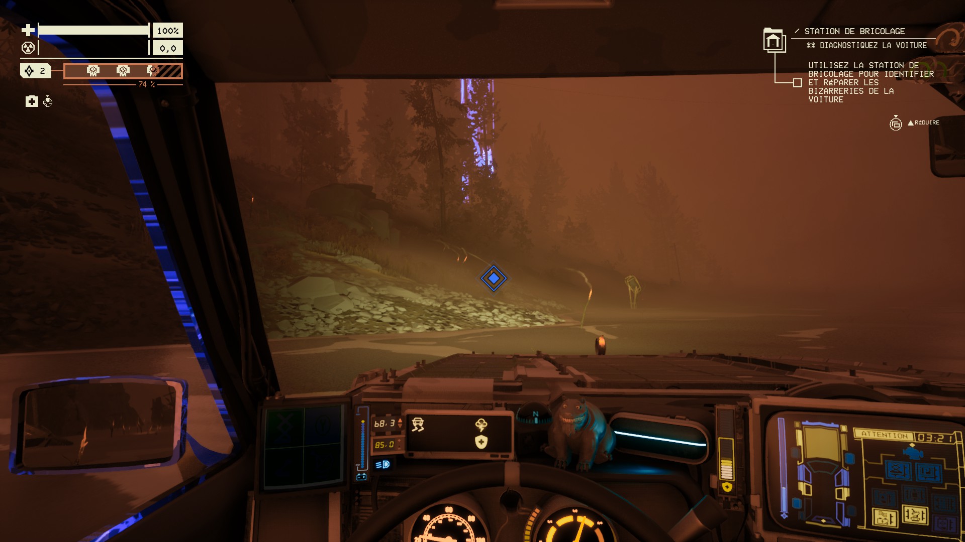 Le bon côté de la chose, c'est que les secteurs ne sont pas soumis aux instabilités : vous pouvez rester autant de temps que vous voulez, aucune tempête ne se déclenchera. Il faut juste rouler plus vite que les nombreuses manifestations qui veulent vous réduire en morceaux. Histoire de ne pas faciliter les choses, il faut savoir que, une fois les artefacts sacrifiés, le portail de sortie s'ouvre aléatoirement quelque part sur la carte : il faut donc être réactif et espérer que ça ne se passe pas en haut d'une montagne alors que les pneus sont flingués ou que le moteur est à l'agonie.