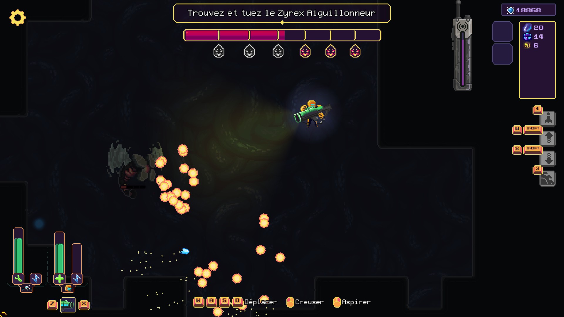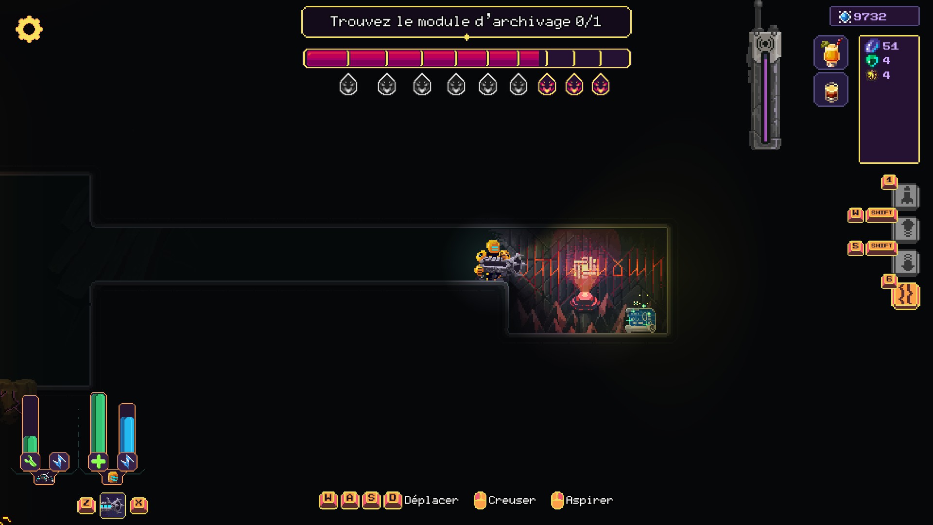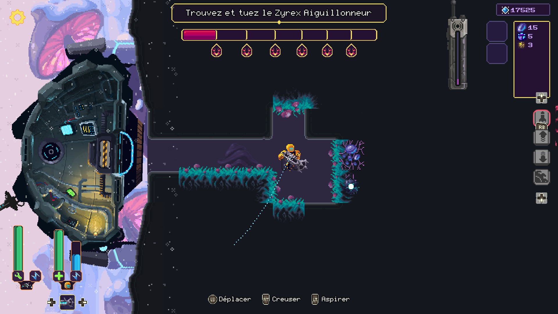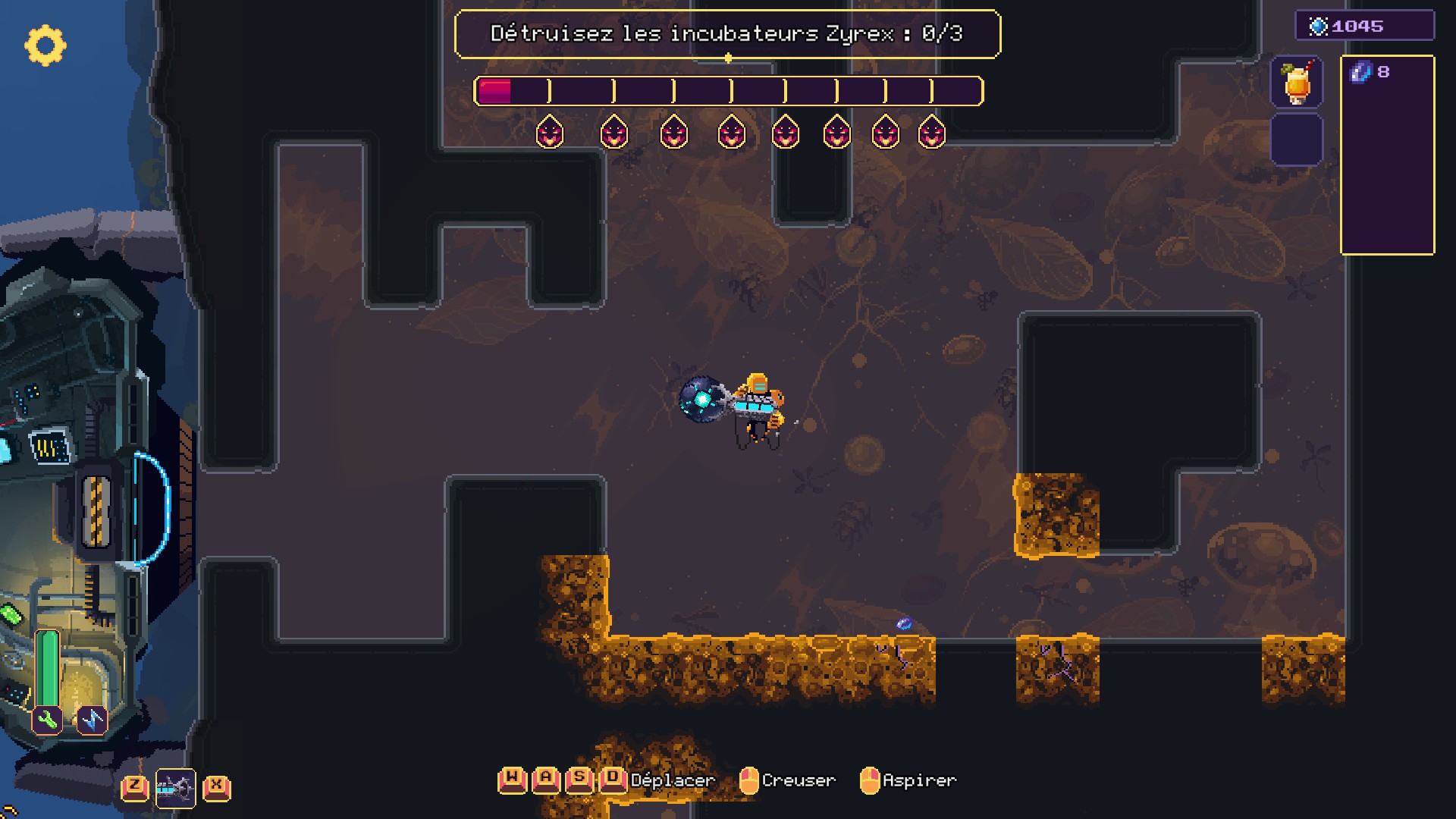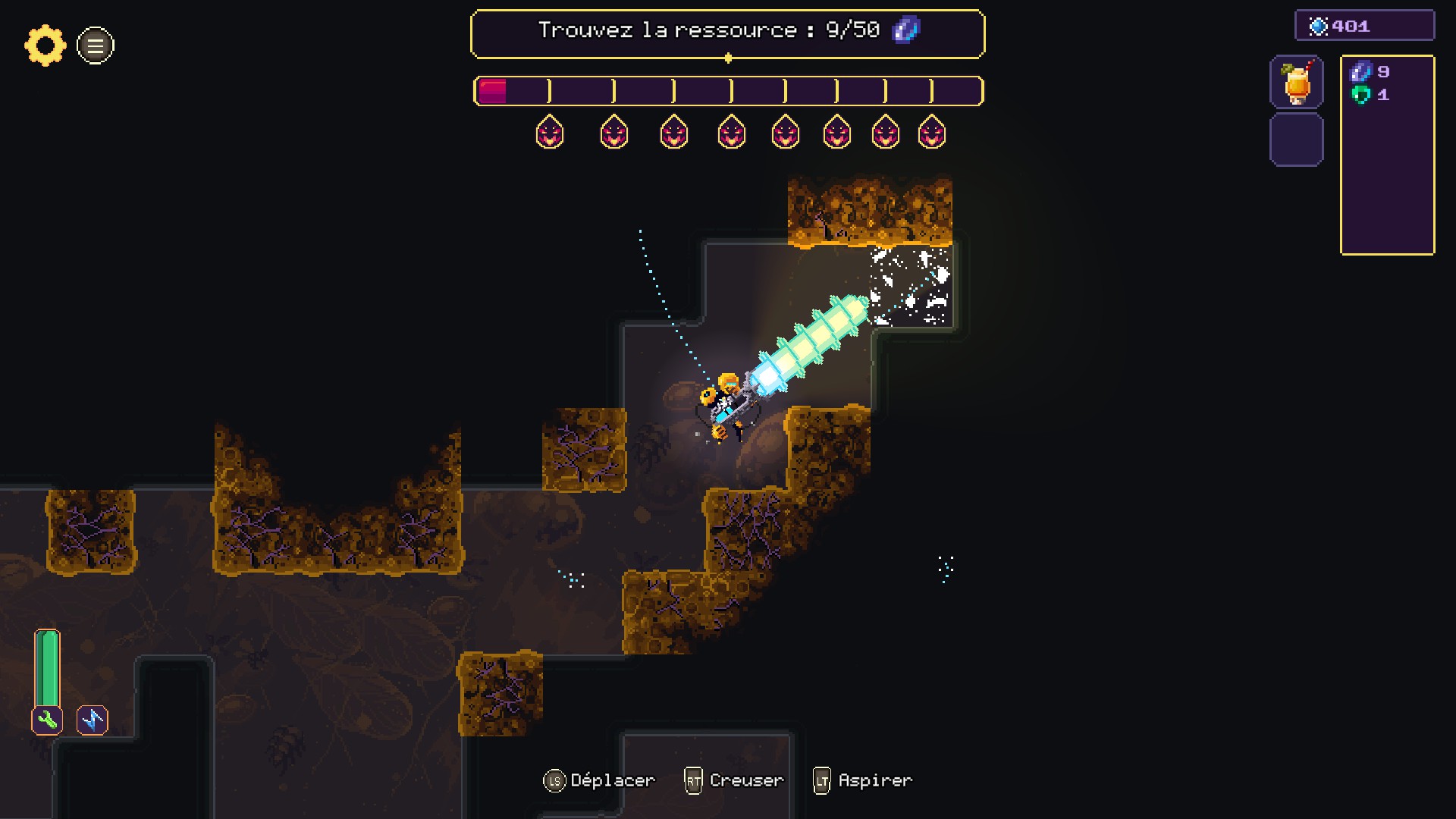 Une fois arrimé, le personnage peut sortir et creuser les galeries. Le bonhomme dispose d'un jet-pack pour se déplacer dans ces couloirs, nul besoin d'installer des échelles ou de craindre de tomber dans un profond puits. Son arme fonctionne sur deux modes : il peut tirer un rayon pour le forage ou se transformer en aspirateur pour récupérer les métaux trouvés. Au fur et à mesure de la progression, d'autres outils s'ajouteront à l'arsenal.