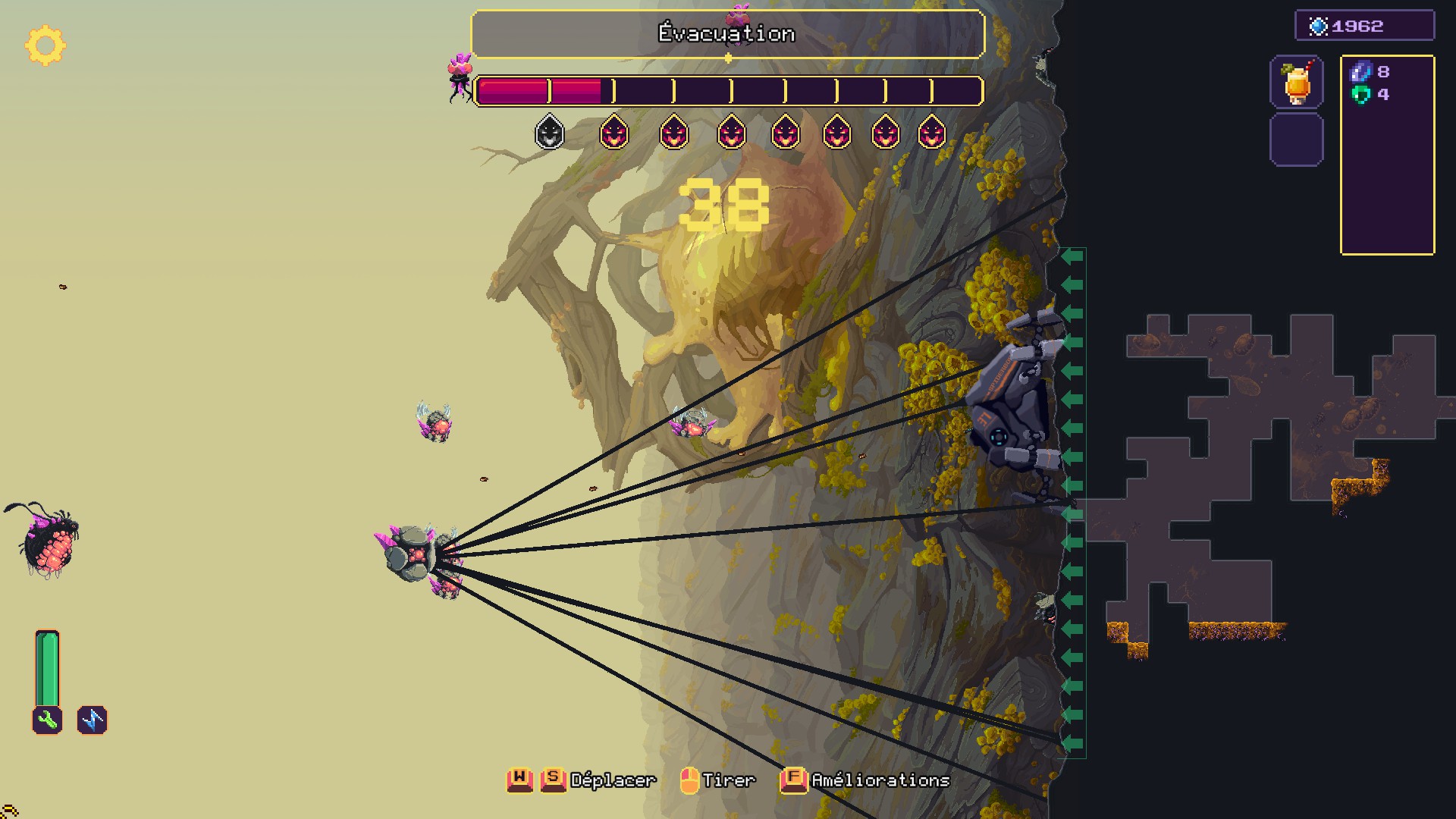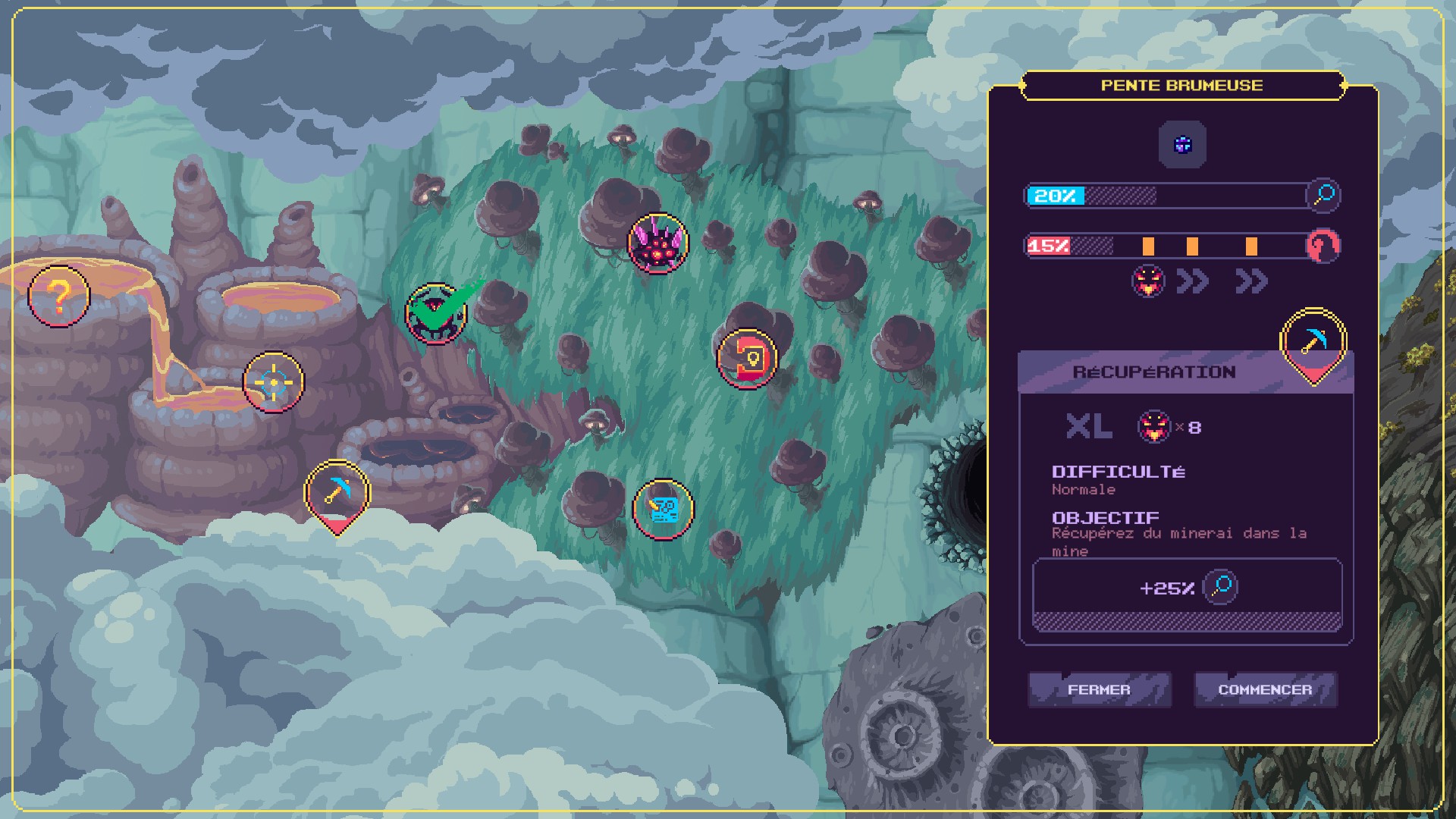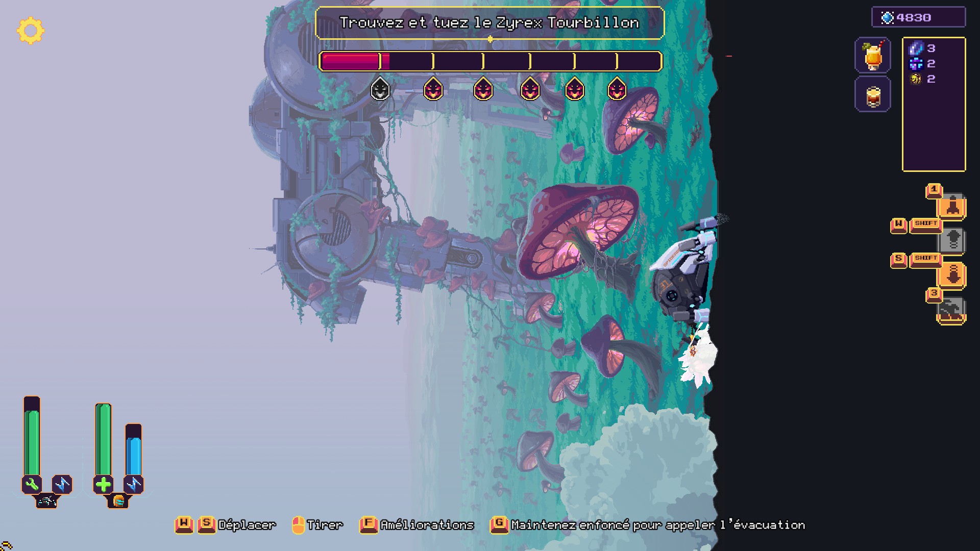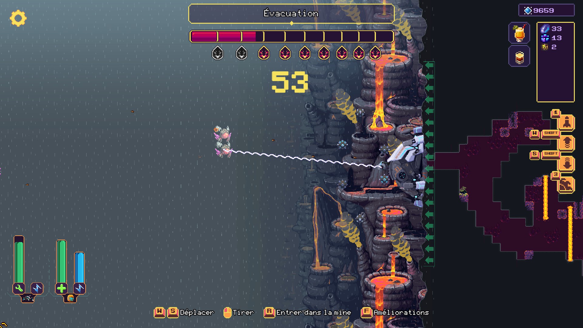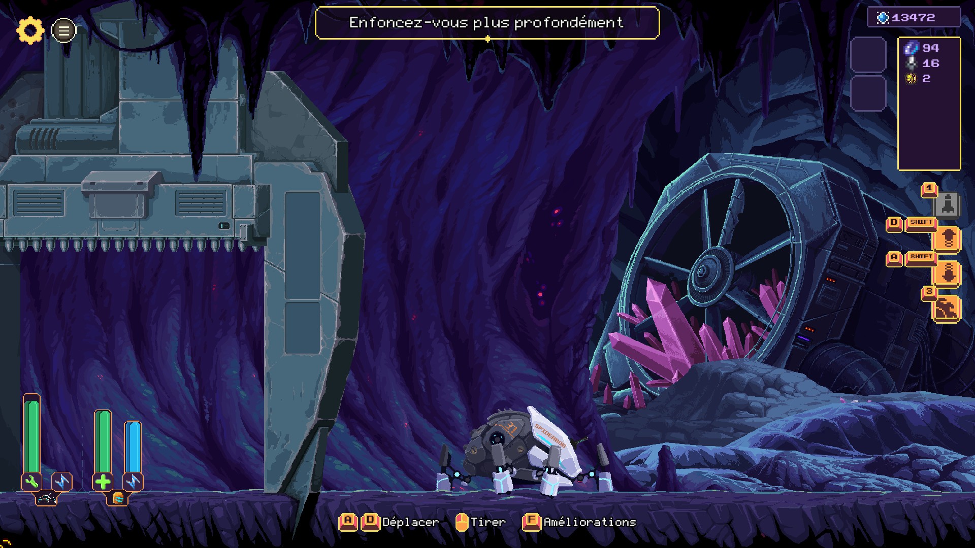 Tout commence par le choix de la mission à accomplir au sein d'une des zones débloquées : récolter une certaine quantité de minéraux, tuer une créature précise, retrouver des objets perdus… Mais avant de commencer, il serait peut-être judicieux d'aller acheter des bonus temporaires au bar voisin. Une fois largué sur place, la disposition des mines et leurs configurations sont générées procéduralement. La machine est agrippée à la paroi, vue de coté, et peut monter ou descendre jusqu'à atteindre une entrée de mine.