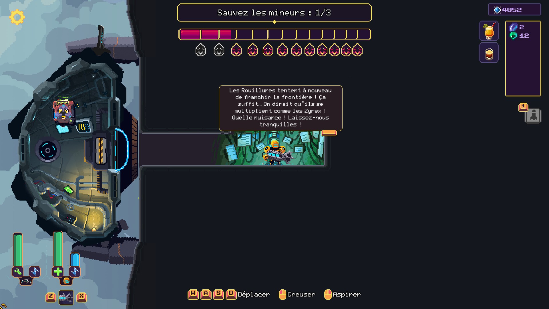 Le jeu alterne donc entre les phases de survie à bord de l'araignée mécanique et celles où on progresse dans la mine. Cette dernière phase de jeu rappelle les classiques du genre : Diggers, Motherload ou SteamWorld Dig (ou Boulder Dash ? Nan, rien ne nous tombe en travers de la figure). Le niveau n'est finalement qu'un vaste damier et on le détruit bloc par bloc afin de progresser.