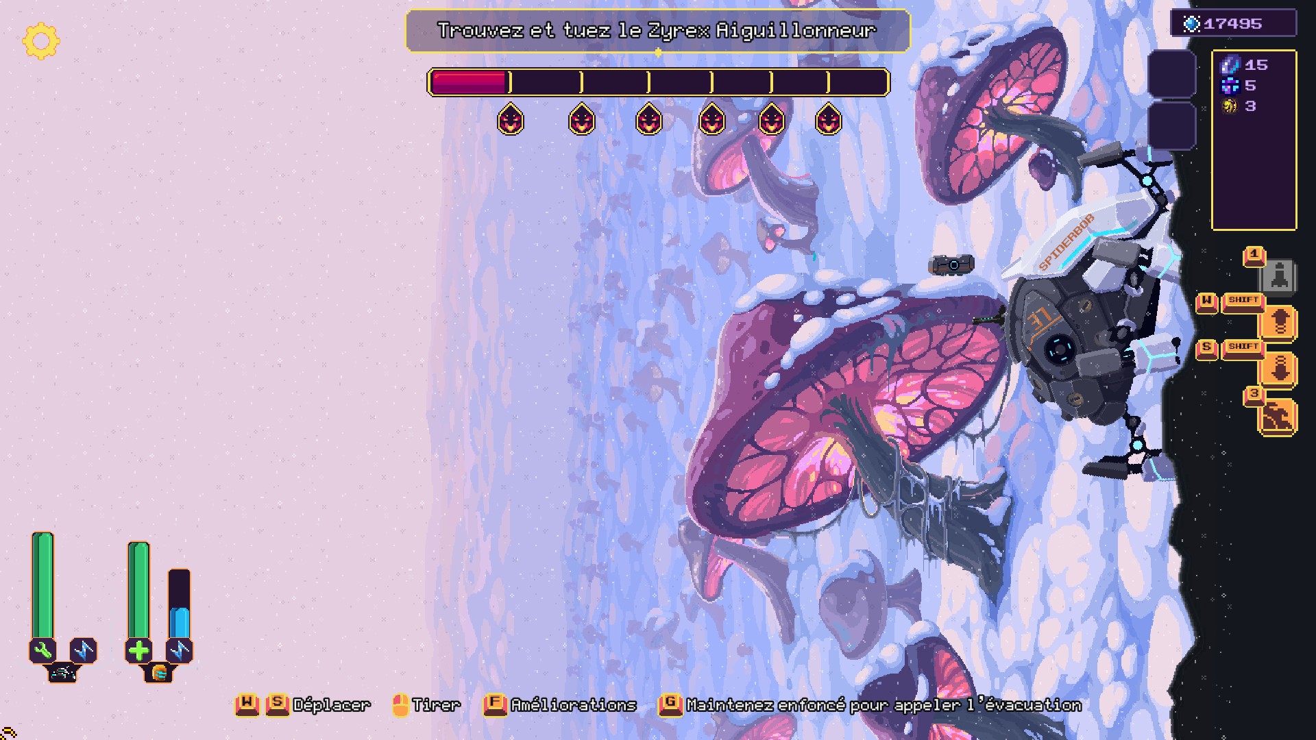 À l'extérieur, des créatures apparaissent régulièrement pour attaquer votre araignée, les Zyrex. Il faut donc vite retourner à bord et défendre chèrement votre peau. Les bestioles ne vous attendent pas gentiment pour commencer l'assaut : il faut donc bien surveiller la jauge de progression de l'animosité extérieure sous peine de se retrouver trop loin pour rejoindre le combat.