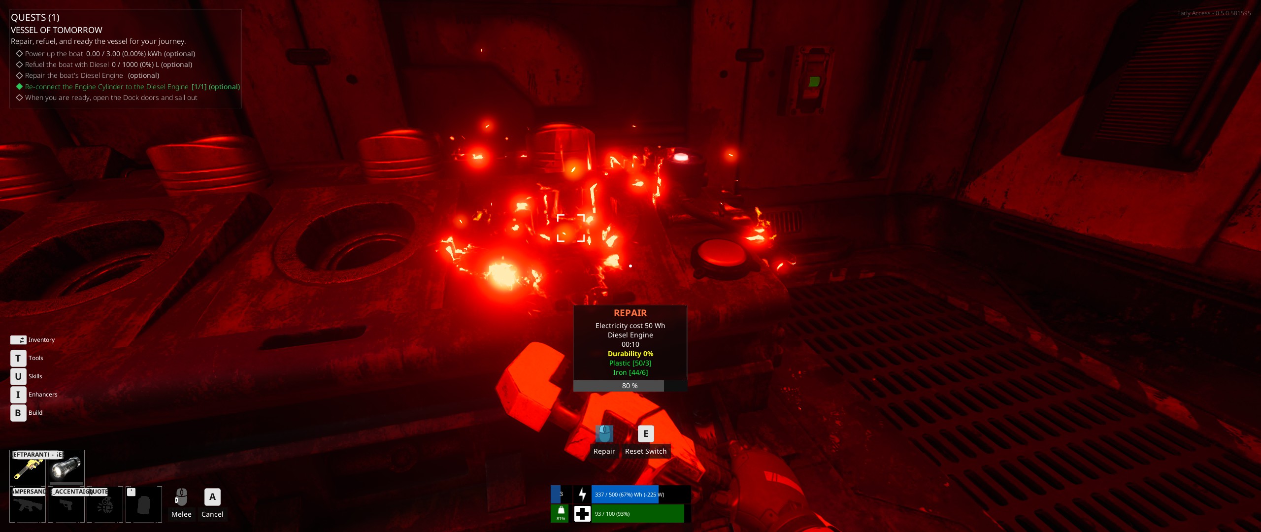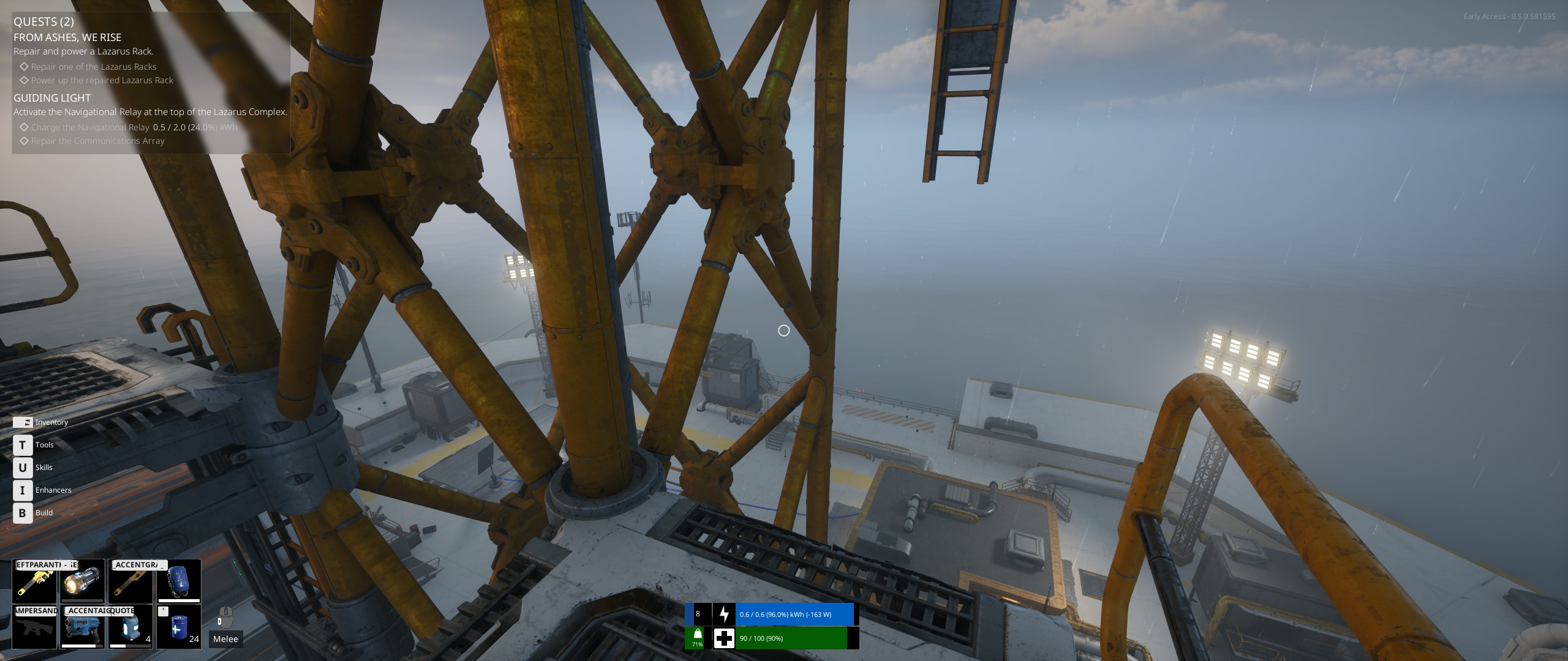 Finalement, je vais parler un peu des combats. Comme je l'ai dit, on croise des créatures hostiles. De petites tailles pour celles que j'ai croisées (dans les eaux, on voit nager des créatures plus grosses, mais elles n'ont pas été hostiles jusqu'à présent). Et quasiment toutes répendent un acide liquide ou gazeux à leur mort. On dispose par défaut d'une attaque au corps à corps (avec un pied de biche si on a les mains libres, sinon avec l'outil ou l'arme équipé) qu'on utilise beaucoup au début, mais qui n'est pas toujours aussi simple d'utilisation qu'on voudrait (parfois on est trop court pour atteindre, parfois le coup est trop lent pour atteindre, parfois on se rapproche trop et on prend des dégâts de contact).