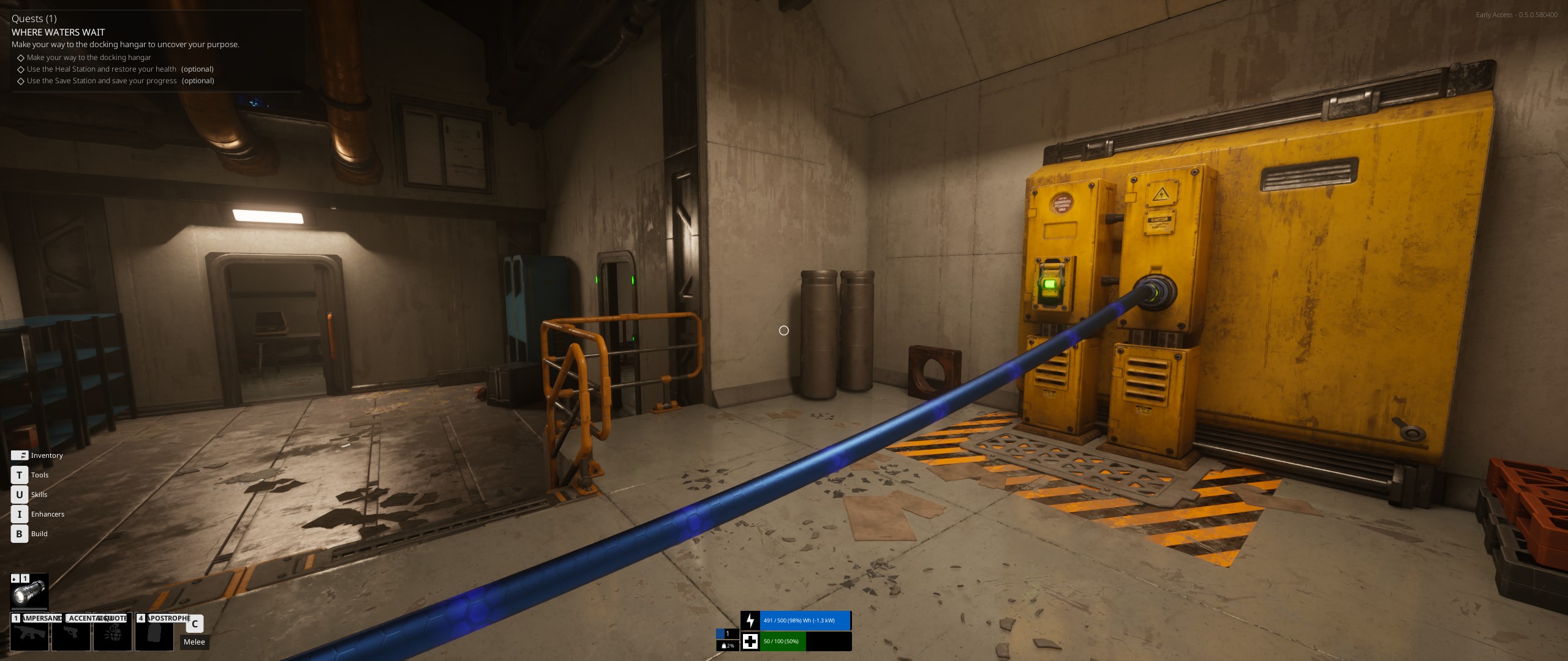 On a les connecteurs sur lesquels on appuie sur E, créant un câble qui en part et qu'on manipule physiquement avant de le brancher sur un autre connecteur en appuyant sur E. Avec un cable électrique, on peut se regarder et appuyer sur E permet de le brancher sur nous, permettant par exemple de regarder sa batterie. E sert aussi à le débrancher. Si on vise mal, on peut débrancher au lieu de brancher (et inversement). En progressant un peu, on peut débloquer un pistolet électrique puis un sac à dos avec une batterie. En plus du E, on a les touches F et V qui servent en plus à brancher/débrancher. Mais, en fonction de là où est l'autre bout du câble, l'action de ces différentes touches n'est pas la même. Encore une fois, ça dépend aussi de où on vise : si on essaye d'interagir avec une prise à nos pieds, on passe très vite d'interagir avec cette prise à interagir avec nous (et inversement).
