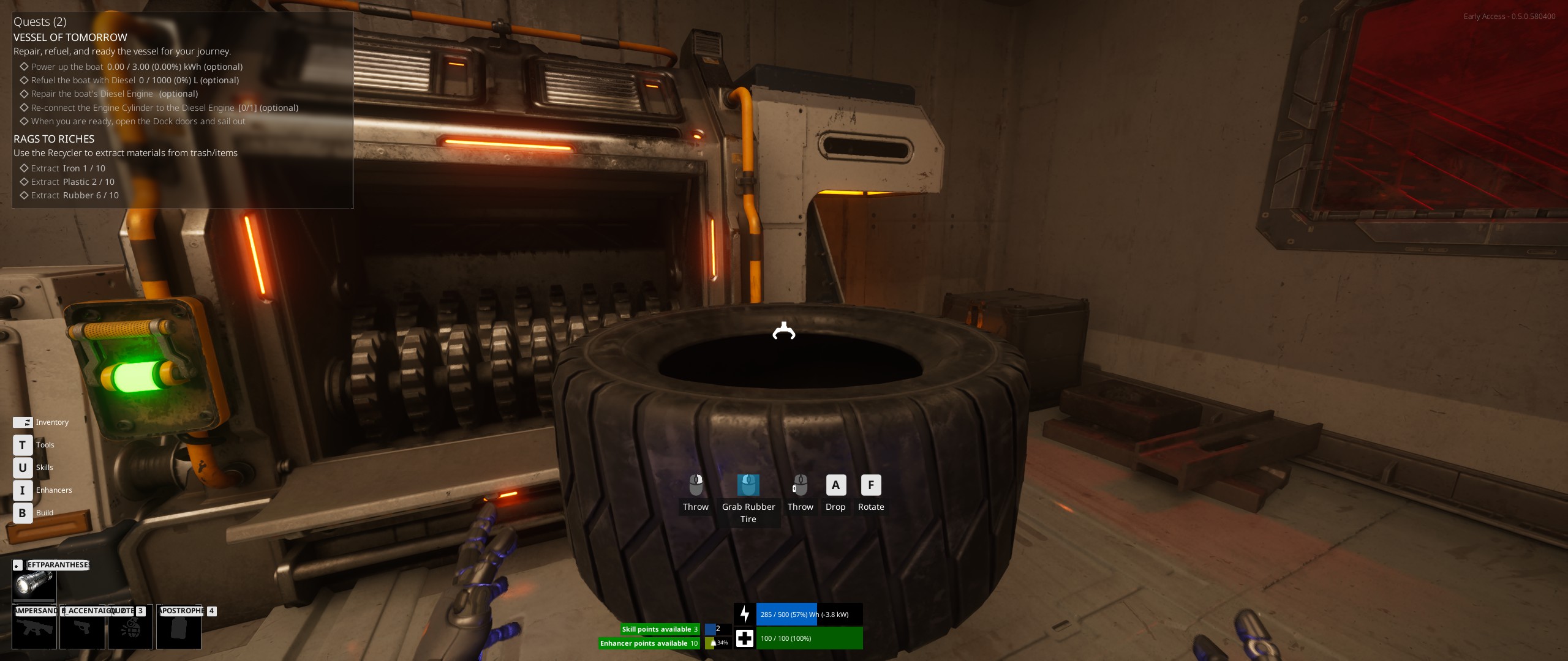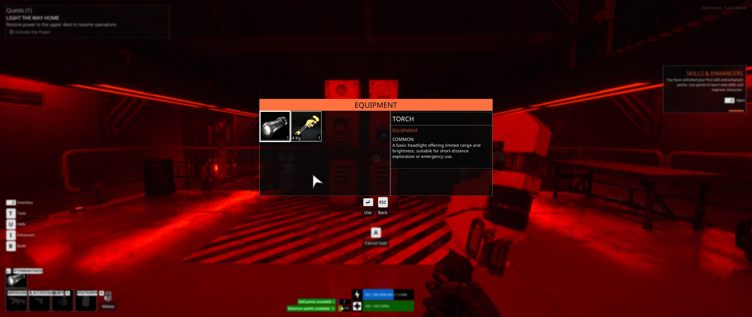 On a deux autres emplacements d'équipement dans l'inventaire, un dédié à la lampe torche et l'autre au sac à dos. Mais pas de touche associée à ces actions. On a à la place la touche T qui ouvre une fenêtre permettant d'accéder à tous nos outils : un pour construire/réparer, un pour démonter, la lampe et le sac à dos. Et on a 4 touches auxquelles associer des actions rapides qui ne semblent pas avoir d'autres utilisations possibles que d'ajouter un raccourci vers ces outils. Avec la blague qu'associer une touche à une action n'est pas aussi évident qu'on le souhaiterait.