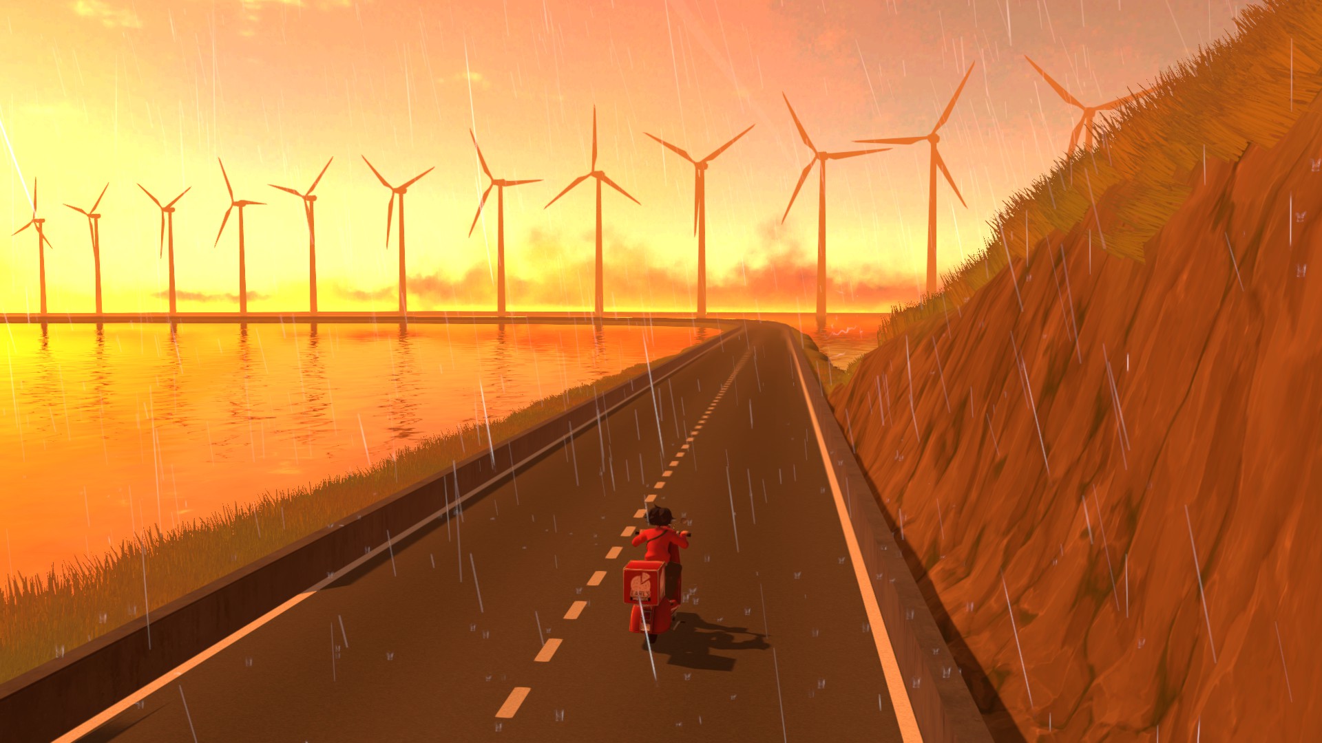 Pourtant, A Pizza Delivery prend la forme de l’un des genres les plus simples sur papier : le walking-sim, que l’on agrémente ici de quelques petites énigmes basiques. B. se déplace ainsi d’une zone à l’autre avec son scooter, examine des objets et discute avec des gens à qui elle peut, éventuellement, offrir une part de pizza. J’insiste sur le « éventuellement », parce que balader la pizza dans les niveaux est totalement optionnel. Pour la partie obligatoire, ça se résume à une séquence demandant un peu de logique et d’observation ainsi que l’un ou l’autre QTE. Dont un à s’arracher les cheveux, tant appuyer simultanément sur pratiquement tous les boutons d’une manette est sans doute la pire idée en matière de QTE de mémoire récente. Je n’imagine même pas la séquence au clavier/souris. Enfin, le jeu n'échappe à la tradition des objets à collecter, ici sous la forme de souvenirs et de boites à musique.