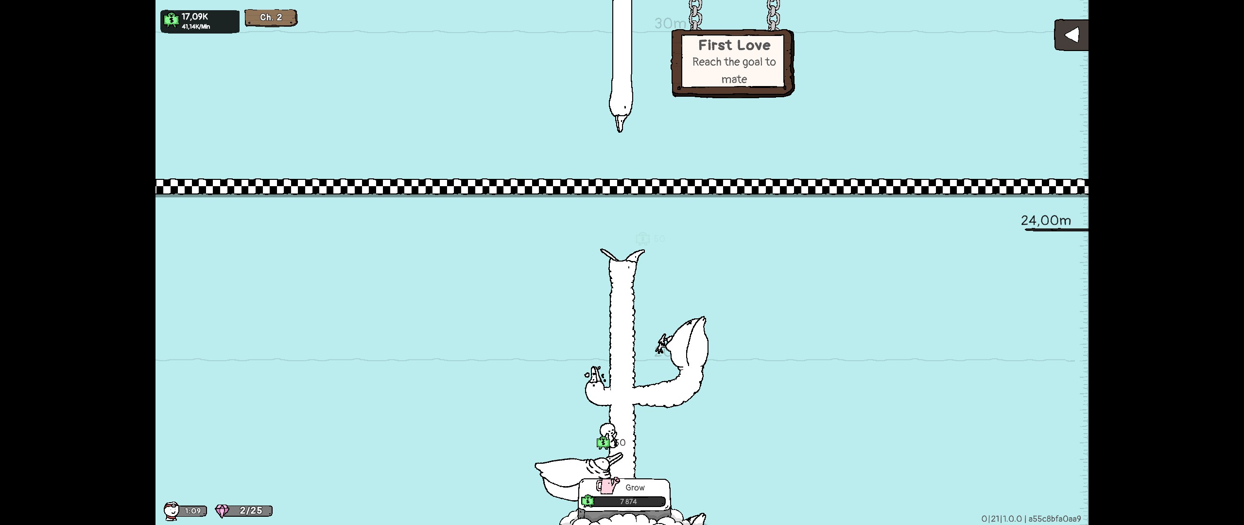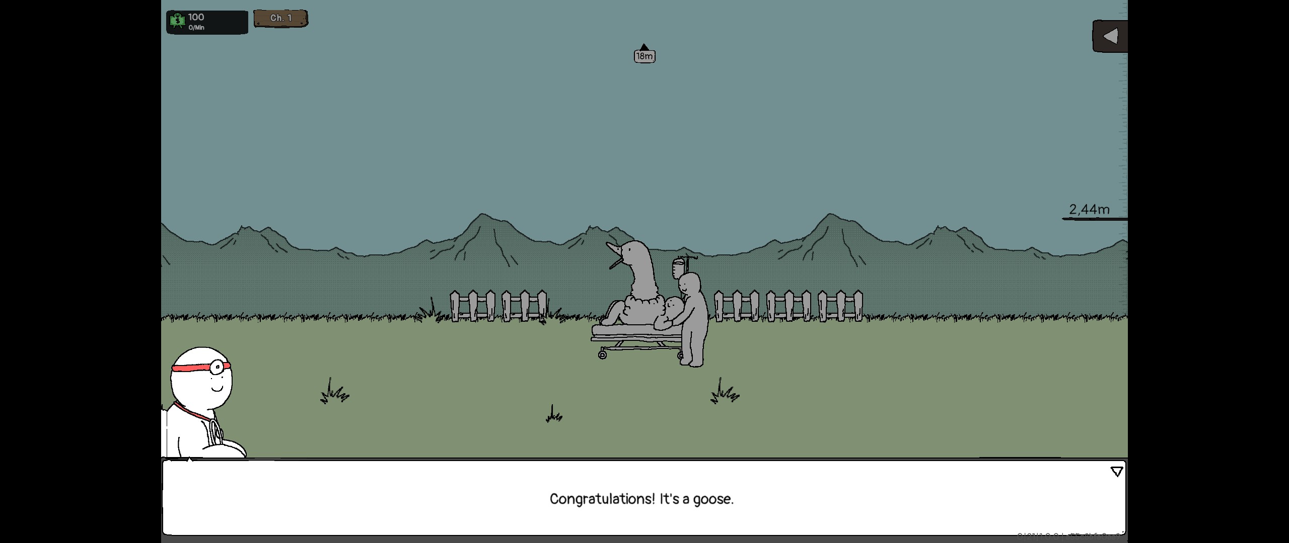 J'utilise beaucoup de guillemets, car ça s'impose. Notre "oie" tient plus de la chimère dont l'apparence n'est dépassée en étrangeté que par la façon dont elle a trouvé vie. On est essentiellement un cou avec une tête au bout, qui pousse à partir d'un objet qui change à chaque chapitre. Le cou s'allonge vers le haut chaque fois qu'on l'arrose. L'arroser demande une somme d'argent toujours plus élevée. L'argent se gagne lorsque les bébés crachés par notre créature tombent sur une de ses excroissances, rejoignent l'homme-cochon-tirelire à la base du cou ou lorsqu'on clique sur un bébé.