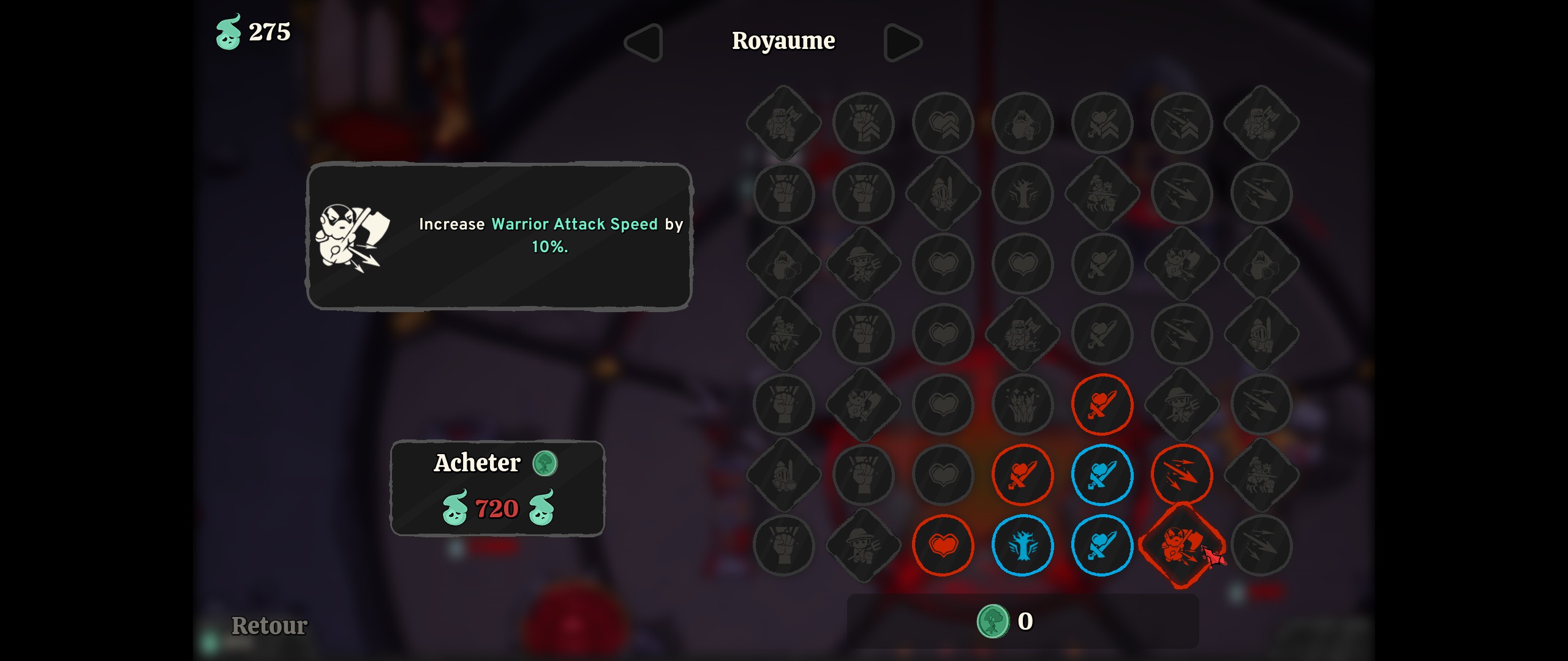 Ces derniers sont débloqués une fois le premier niveau complété et se présentent comme deux arbres avec un donnant des bonus pour les créatures du premier monde et l'autre pour les créatures du second monde. Avec beaucoup de redondance entre les deux, il est dommage d'avoir à choisir dans quel monde progresser et ne pas plutôt avoir un arbre unique avec des bonus qui s'appliquent à toutes les créatures, sans distinction de monde, et d'autres qui ne s'appliquent qu'à un type de créature. Le coût en âmes des points est progressif (mais indépendant par arbre), mais il pourrait débuter à un tarif un peu plus bas afin d'accélerer les premiers pas dans ceux-ci alors qu'il reste des reliques à reconstruire.