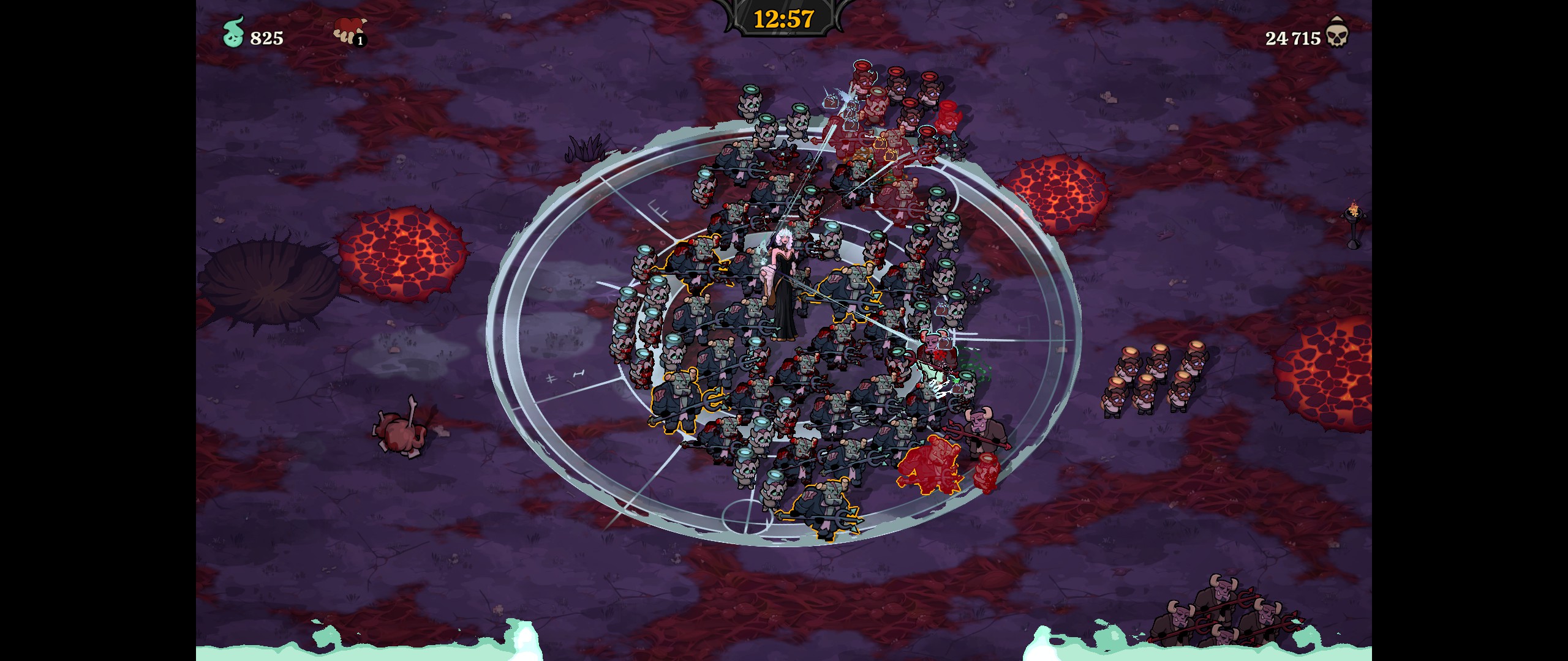 Tous les bonus obtenus en montant en niveau sont perdus une fois la partie terminée - après avoir battu le boss ou être mort. Cependant, chaque mort ramené à la vie nous donne une âme qu'on conserve. Ces âmes servent une fois rentré à la base pour soit reconstruire des reliques qui donneront des bonus à notre personnage (nombre de morts qu'on peut ressusciter simultanément, portée de la résurrection, vitesse de déplacement, santé maximale, régénération, possibilité de relancer le choix de bonus à la montée en niveau...) soit débloquer des bonus pour nos morts-vivants.