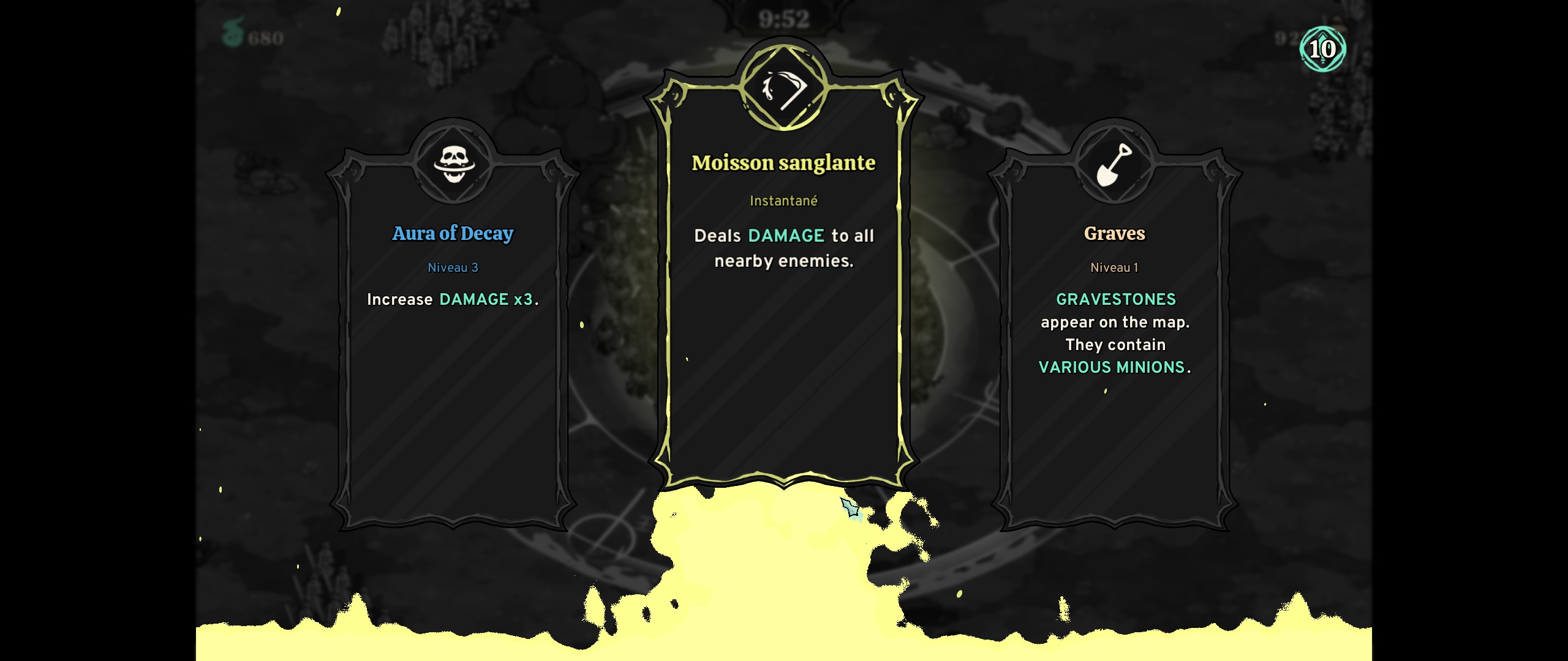 De plus, chaque fois qu'on réveille un mort, on gagne de l'expérience afin de progresser en niveau. À chaque niveau, on a le choix entre trois bonus, qui peuvent être une magie que notre personnage utilisera automatiquement, des bonus qui s'appliquent à notre armée ou au monde, des améliorations pour les bonus précédemment choisis ou une action spéciale à usage unique qui s'active dès qu'on le récupère.