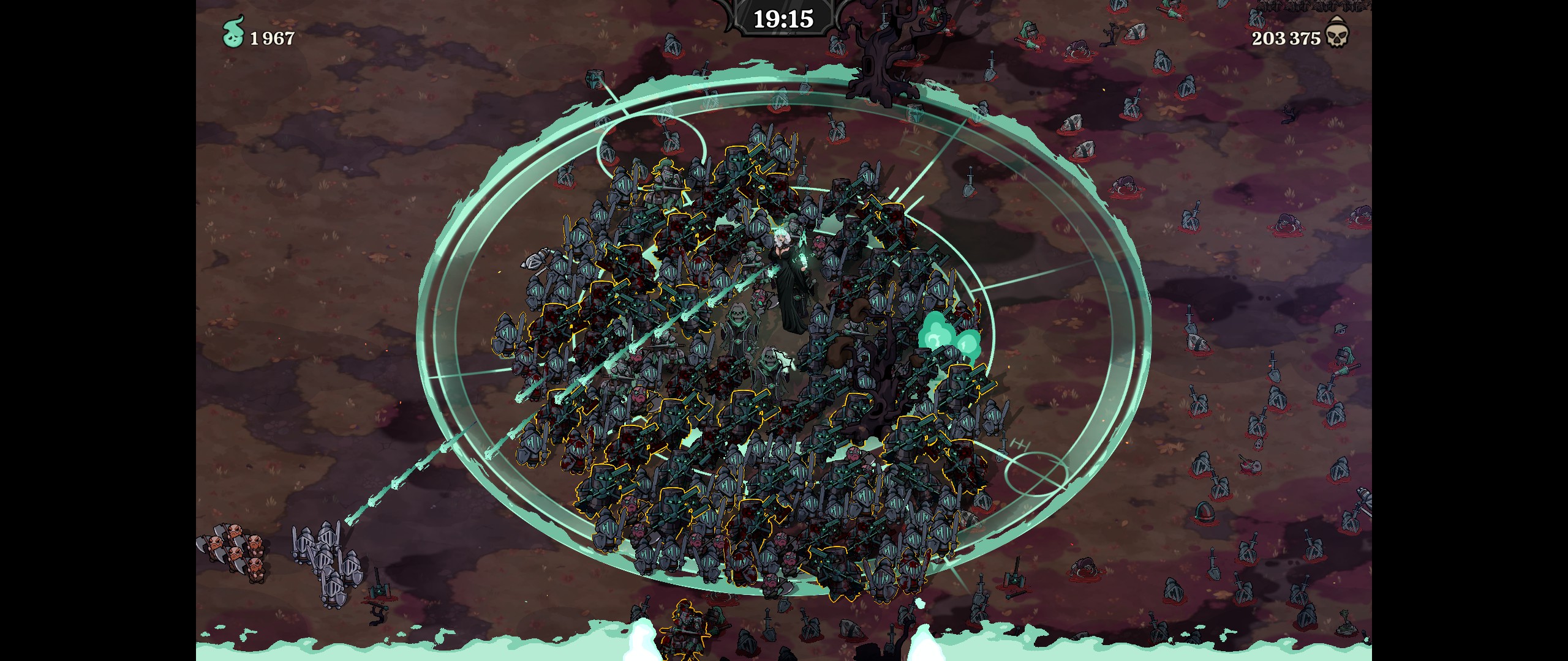 Dans le monde, on croise des groupes d'ennemis - qu'on convertit en notre armée une fois morts - mais également des urnes donnant du soin (et pouvant donner un bonus de dégâts si améliorées). On peut avec les bonus de niveau y ajouter des tombes pour une nouvelle source de morts, des cercles d'invocations, etc. De quoi apporter un peu de variation d'une partie à l'autre en fonction de nos choix.
