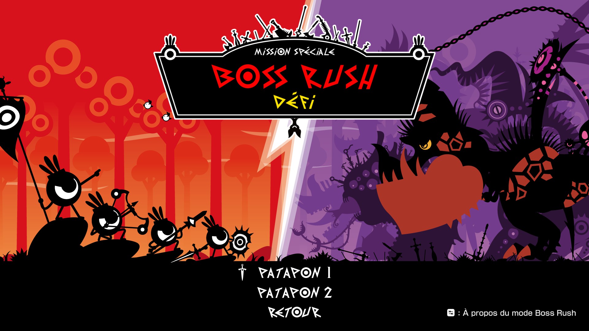 Il existe en réalité deux challenges, chacun associé à un scénario (Patapon 1 ou 2). Une fois votre sauvegarde sélectionnée, vous retrouvez votre armée avec les unités et équipements tels que vous les aviez laissés.