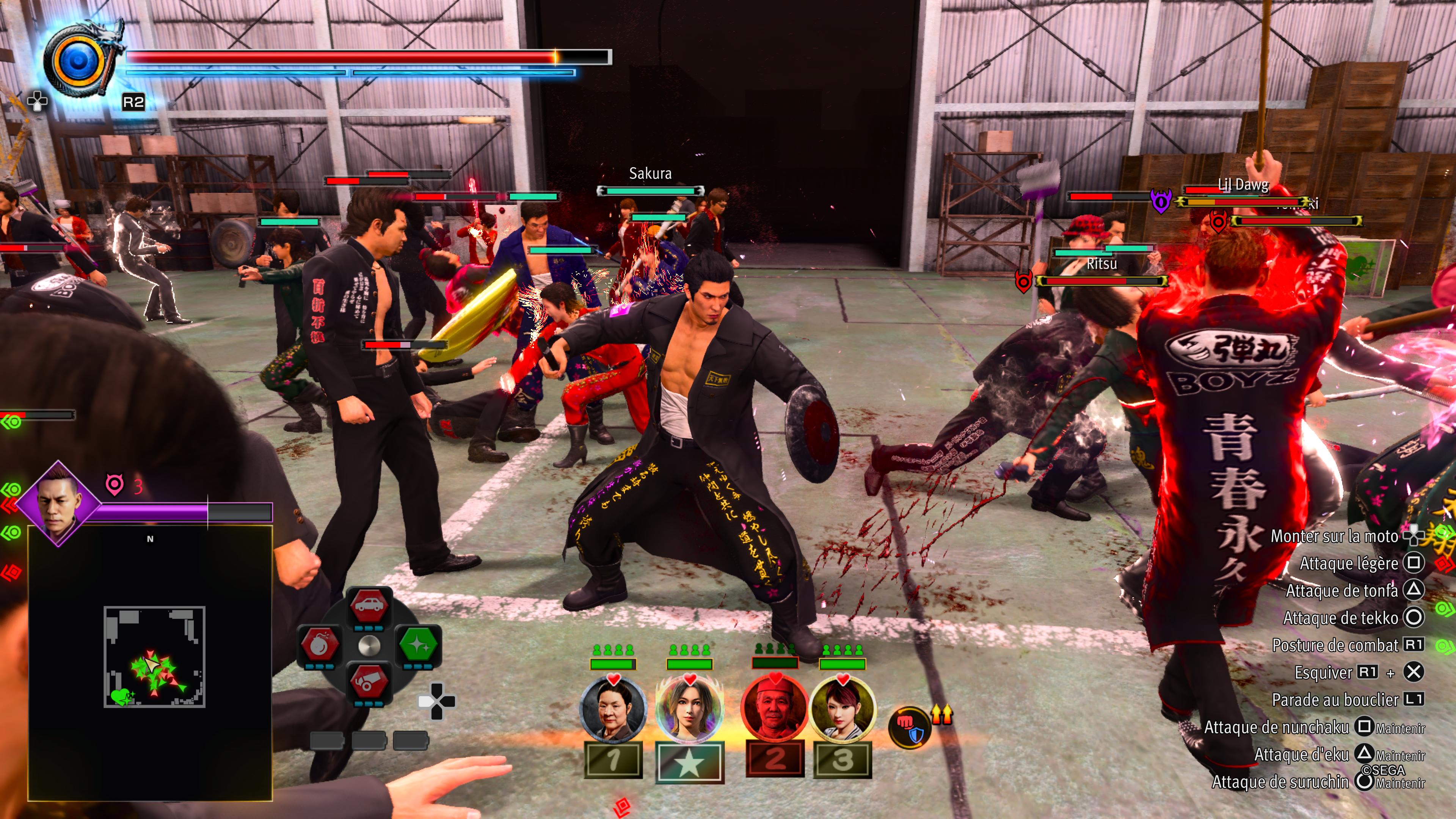 Et ces nouveaux styles de combats remaniés ont une conséquence directe sur toutes les techniques de combat que Kiryu pouvait apprendre dans Yakuza 3 : exit les révélations absurdes capturées au téléphone portable, exit le fameux tiger drop enseigné par Komaki... Pas mal d'histoires secondaires passent à la trappe et elles sont loin d'être les seules. Certaines sont encore là, mais avec la refonte, en plus de la gestion de l'orphelinat, il y a eu du renouvellement pour le meilleur comme pour le pire. Ne nous le cachons pas : la plupart sont assez insipides et pas très drôles et, pour remplacer un peu tout ça et redonner autre chose à vivre à Okinawa d'intéressant, Kiryu se retrouve cette fois à la tête d'un gang de bikeuses local aux prises avec un énorme gang de Tokyo qui étend son emprise au soleil. C'est le prétexte à de nouveaux affrontements généraux avec des gens à recruter, des escouades à former et des raids à mener comme on pouvait déjà en vivre dans les aventures de Majima pirate. Rien de très nouveau au soleil de Ryukyu, mais ça reste un contenu sympathique à défaut d'être vraiment très original et un prétexte pour des grosses bastons en bande assez rigolotes.