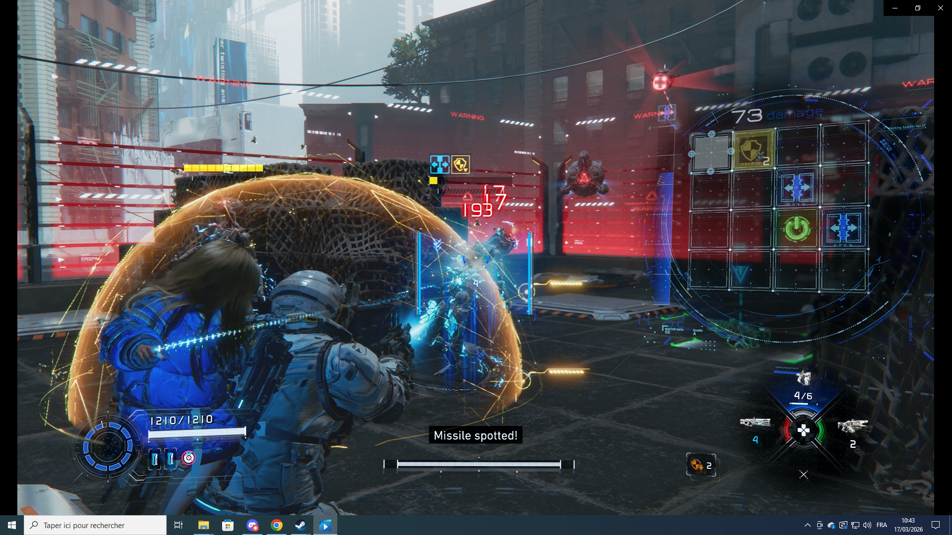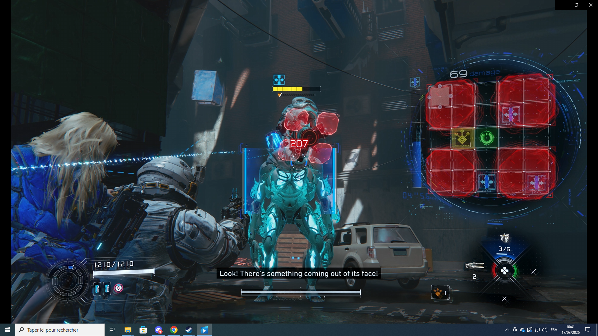 Quelques mots sur le Boss de fin de section, un immense quadrupède équipé de puissants lasers. Évidement, il fallait réussir des piratages pour le rendre vulnérable quelques secondes. Mais pour ça, il fallait être suffisamment proche pour que Diana puisse le faire, tout en évitant les larges attaques. Une des nouveautés de certains ennemis utilisé par le boss était les boucliers anti-piratage. Concrètement, l'ennemi se dote de quatre petites zones rouges sur son corps, qui tant qu'elles sont actives verrouillent un quart de la grille de piratage. Il faut donc en détruire, une ou plusieurs, afin de pouvoir à nouveau le rendre vulnérable. Un affrontement intéressant, en plus de l'aspect impressionnant des proportions. On ne montre pas d'images pour ceux qui veulent garder la surprise.