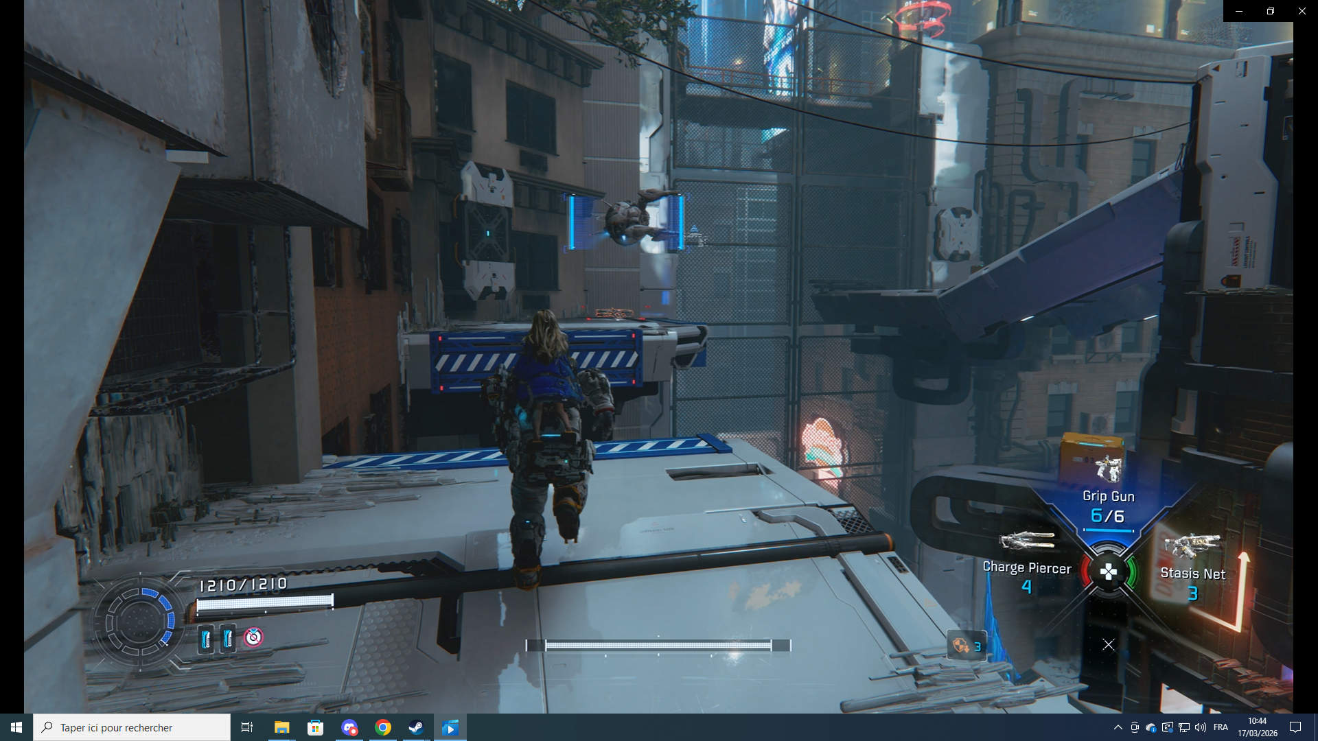 Le personnage se déplace de manière fluide, tout en ayant une certaine lourdeur due à son armure. Ce dernier point se ressent d'ailleurs avec l'utilisation des propulseurs, qui permettent juste de s'élever ou de planner quelques secondes, ou les dashs. Ce n'est pas du tout un mal, c'est assez logique. Les ennemis sont pensés en conséquences, avec des déplacements ou des rythmes d'attaques relativement lents. Pour l'équipement, il est possible de transporter trois types d'armes différentes en plus du pistolet standard. Elles se sélectionnent au Refuge ou se trouvent durant l'exploration. Entre le fait qu'elles aient des fonctions assez différentes (grenade paralysante, simili fusil à pompe, etc) et le faible nombre de munitions, il faut bien jauger leur utilisation en combat. Pour le piratage, il y a ici et là des consommables ajoutant un bonus sur la grille, comme une plus grande vulnérabilité de la cible ou le fait que cela affecte aussi les androïdes proches. Mais ils sont aussi en nombre très limités d'utilisation, il faut donc encore jauger l'utilité à chaque situation. Pour les combats en eux-mêmes ils sont du coup assez tactiques et peuvent mettre une certaine pression bienvenue. Dans cette session, plusieurs combats se sont déroulés sur des toits face à des ennemis volants éloignés. Cela forçait à se rapprocher pour les pirater, tout en évitant de se faire toucher. En outre, plusieurs affrontements se sont déroulés dans un espace très restreint alors qu'il y avait plusieurs ennemis, de différents types ; ce furent des passages intéressants. Le gameplay m'a semblé plutôt bien pensé, cohérent, dans son ensemble, et je l'ai trouvé plutôt agréable.