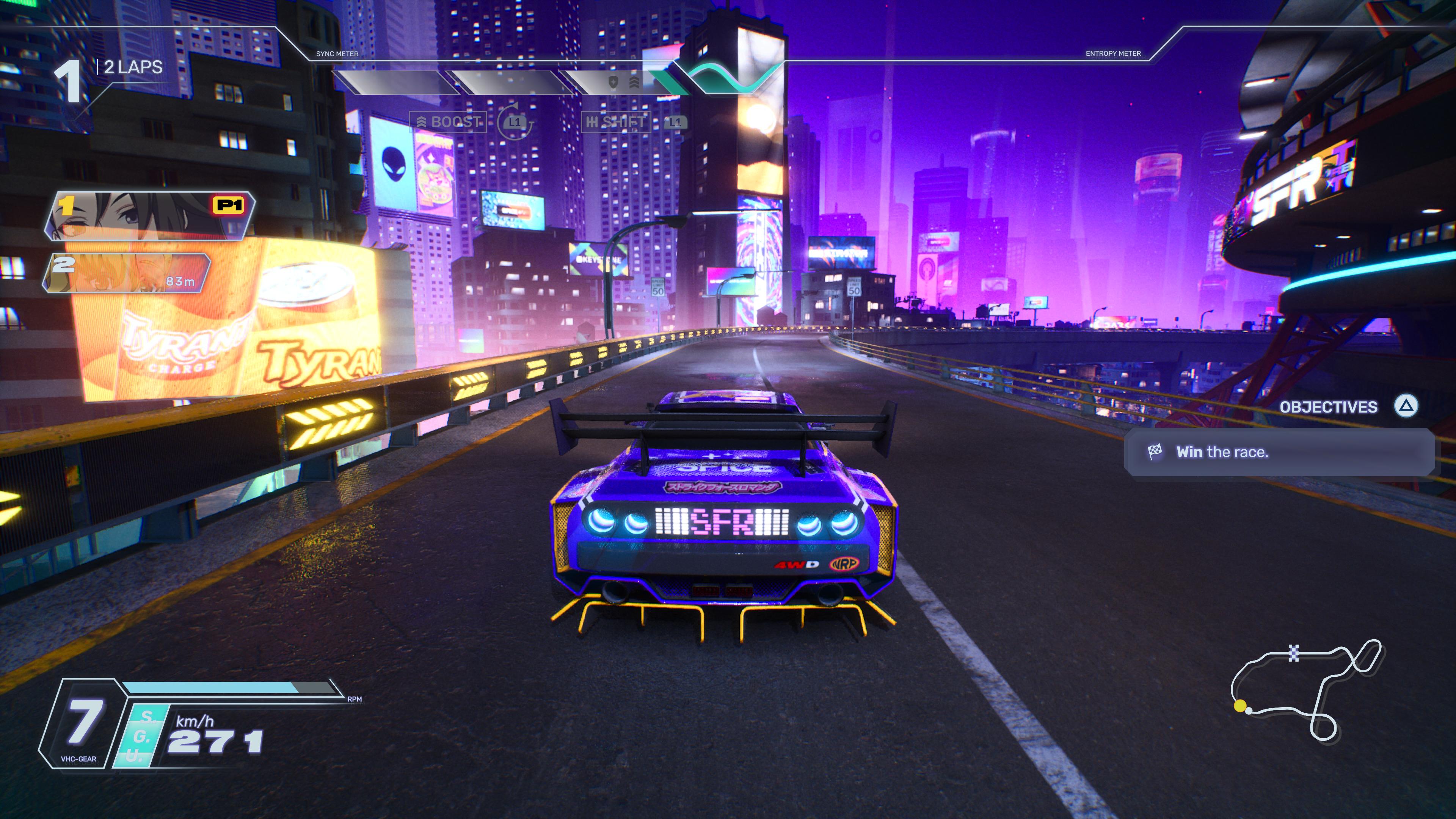 Screamer, c'est la promesse d'un retour à une époque où les jeux de course se prenaient un peu moins au sérieux ; du moins, côté gameplay. Peu intéressé par les courbes bien abordées et la recherche du point de corde, le jeu a quelque chose de plus viscéral qui cherche du côté d'une sur-utilisation du drift pour compenser la lourdeur de véhicules dont le rayon de braquage est quasiment nul. Pour ce faire, le stick gauche permet de (légèrement) tourner d'un côté ou de l'autre et le stick droit provoque le drift. L'association des deux permet de braquer de manière plus importante. À haute vitesse, cela donne des courses relativement techniques, où il faut plutôt bien anticiper les virages très serrés pour espérer les passer avec le moins de dégâts possible. Inévitablement, on se prend un paquet de murs au début, et puis même plus tard dans le jeu, en s'apercevant assez vite que selon l'angle auquel on touche le mur (de préférence sur l'un des côtés de la voiture), la punition est minimale et ne fait pas toujours perdre plus de temps qu'un freinage. Et c'est là que l'impression initiale, plutôt positive, s'écroule complètement. La conduite à deux sticks relève du gimmick tant il est quasi-obligatoire à chaque virage de l'utiliser et cette conduite ne trouve pas l'équilibre propre à certains jeux cultes de l'époque qu'il cherche à convoquer, notamment du côté des Ridge Racer, peinant donc à trouver le fun qu'il tente si fort de mettre en avant. Les courses, la faute à des tracés qui abusent et sur-abusent de virages en épingle ou, a minima, très serrés, ressemblent vite à une foire aux rebondissements contre des murs et les véhicules des adversaires. L'autre souci, c'est l'impression trop prégnante d'un rubber-banding, c'est-à-dire le phénomène où les voitures derrière nous gagnent en efficacité, tandis que celles à l'avant ralentissent. Bien que nécessaire pour donner sens aux systèmes d'attaque et de boost du jeu peu importe la difficulté choisie, ce système apparaît souvent très artificiel, trop visible, avec la frustration d'ennemis qui alignent soudainement les meilleurs virages de leur course pour reprendre la tête à quelques mètres de l'arrivée. Mais alors, comment s'en défendre ? Hé bien, le gameplay repose sur plusieurs éléments. Le boost, d'abord, qui permet en remplissant une jauge de déclencher un (court) boost qui augmente considérablement la vitesse, y compris en touchant les murs, ce qui permet de le déclencher en virage pour prendre un avantage important sur des adversaires qui freinent au même moment. Une deuxième jauge permet, elle, de déclencher des "strike", de courts dash qui détruisent (pour quelques secondes) les adversaires sur notre chemin. Enfin, un système "d'overdrive" permet de combiner boost et strike en même temps, sorte d'étoile de Mario, où l'on risque toutefois d'exploser en touchant le moindre mur. Côté défense, un bouclier (reposant sur la même jauge que le strike) est disponible, ainsi que des pouvoirs spécifiques à chaque personnage. Par exemple, l'un d'eux peut bénéficier d'un deuxième boost, plus court, à déclencher juste après le premier. Cet ensemble de pouvoirs dynamisent des courses qui reposent énormément dessus, beaucoup plus que sur la qualité du pilotage, puisque peu importe la qualité des drifts et une course parfaite, la voiture ne sera jamais aussi rapide qu'un adversaire qui utilise son overdrive au bon moment. Est-ce un mal, à vous de juger ; de notre côté, on a trouvé la combinaison de toutes ces mécaniques assez faiblarde. Vite rébarbatif, ce système plonge les courses dans une routine qui ne fait pas beaucoup de bien au "fun" qu'il recherche. Pire, avec sa conduite peu satisfaisante et de toute manière très dépendante des pouvoirs, Screamer a assez peu d'arguments pour nous pousser à travailler les tracés et améliorer nos temps.Nostalgie animée