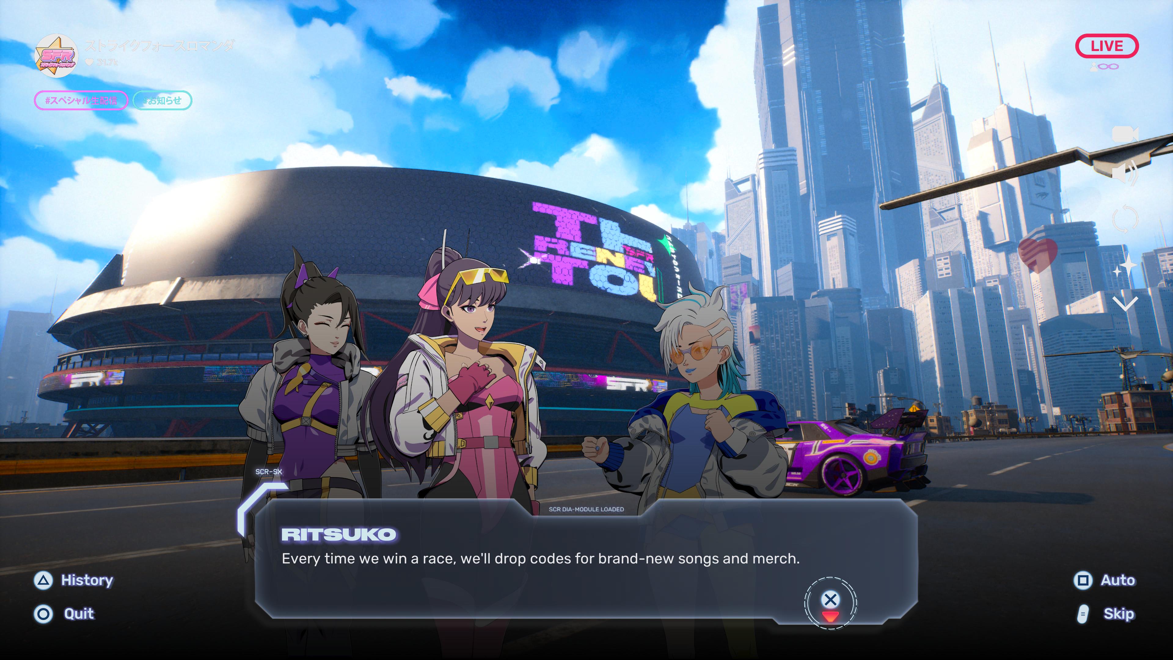 Pour offrir un nouveau souffle à la licence, Milestone a complètement revu son approche des jeux de course en allant chercher cette fois-ci quelque chose de plus narratif. En reposant pour l'essentiel sur son histoire, même si Screamer offre des modes libres (courses, contre la montre, jeu en ligne...), le titre nous emmène dans son "tournoi", une grande compétition où s'affrontent cinq équipes. Ces équipes sont issues de factions diverses, allant de soldats à de quelconques criminels ou même à un groupe d'idoles et l'ensemble emprunte sa direction artistique à un imaginaire qui rappelle les anime japonais des années 1990. Dans un monde futuriste, où les criminels s'affrontent dans un tournoi organisé par quelqu'un de mystérieux, on se retrouve à jouer un peu tout le monde à tour de rôle dans une succession de courses entrecoupées de dialogues en scènes statiques à la manière d'un visual novel. De temps en temps, l'histoire propose des cinématiques anime de jolie facture, mais pour l'essentiel, on a quelque chose de très mou sur la mise en scène. L'écriture n'aide pas, avec une histoire qui raconte des évènements à multiples rebondissements auxquels on croit peu et surtout une multitude de personnages dont on se fiche très vite. La narration tente parfois d'être rigolote, sans qu'on rigole vraiment, d'autres fois plus triste, sans vraiment avoir d'impact émotionnel. L'intérêt principal de ce mode histoire, central au jeu, est surtout d'apprendre à utiliser les mécaniques (introduites lentement) et de débloquer les différents pilotes ainsi que leurs voitures, même si l'on peut aussi les débloquer dans les autres modes, ainsi que les tracés. Idem pour les objets de customisation des véhicules, essentiellement des couleurs et stickers, même s'ils n'apportent pas tant de variété ou d'intérêt à l'aventure. Peut-être que l'on aurait aimé une mise en scène un peu plus appuyée ou des courses qui exploitent mieux les enjeux, mais on s'aperçoit que chaque passage sur la piste ressemble au précédent, avec des objectifs qui se répètent (passer des checkpoints, finir sur le podium, détruire un véhicule précis...) entre deux séquences narratives trop longues pour leur bien. C'est dommage, car apporter un vrai angle narratif à un jeu de course est une excellente idée, mais il lui manque quelque chose pour être vraiment intéressant à jouer. On se perd même un peu parfois dans ses enjeux, même si un patch day one est censé venir réarranger certains dialogues pour clarifier les évènements. À voir leur impact, mais cela ne rendra pas les courses plus palpitantes. La direction artistique a toutefois ses bons moments, notamment dans les courses en ville au début de l'histoire qui, de nuit comme de jour, sont plutôt jolies. Mais les choses se gâtent dans les autres environnements : une forêt, une zone industrielle, grises et tristounettes à l'image et qui tranchent avec l'ambiance quasi-cyberpunk du premier contact ou avec l'ambiance imposée par sa sympathique bande-originale. Les voitures, elles, sont plutôt réussies, avec des designs marqués et reconnaissables qui rendent plutôt bien compte des personnalités de chaque personnage. Il y a, d'ailleurs, des différences parfois importantes dans le comportement des véhicules en fonction des personnages, certains étant plus agiles que d'autres, et ça se traduit aussi dans leur design. Néanmoins, il faut noter des soucis techniques, notamment sur la stabilité du framerate qui a tendance à souffrir sur PlayStation 5. On voit de vraies différences au sein d'une même course selon le nombre de véhicules affichés à l'écran ou sur certains passages, et ces variations peuvent être déconcertantes même si elles n'ont pas d'impact direct sur la course et la facilité, ou non, à prendre chaque virage. Peut-être peut-on espérer un patch, à l'avenir, pour une meilleure stabilité. Mais cela commence à être une habitude avec les jeux qui exploitent l'Unreal Engine 5.Conclusion
