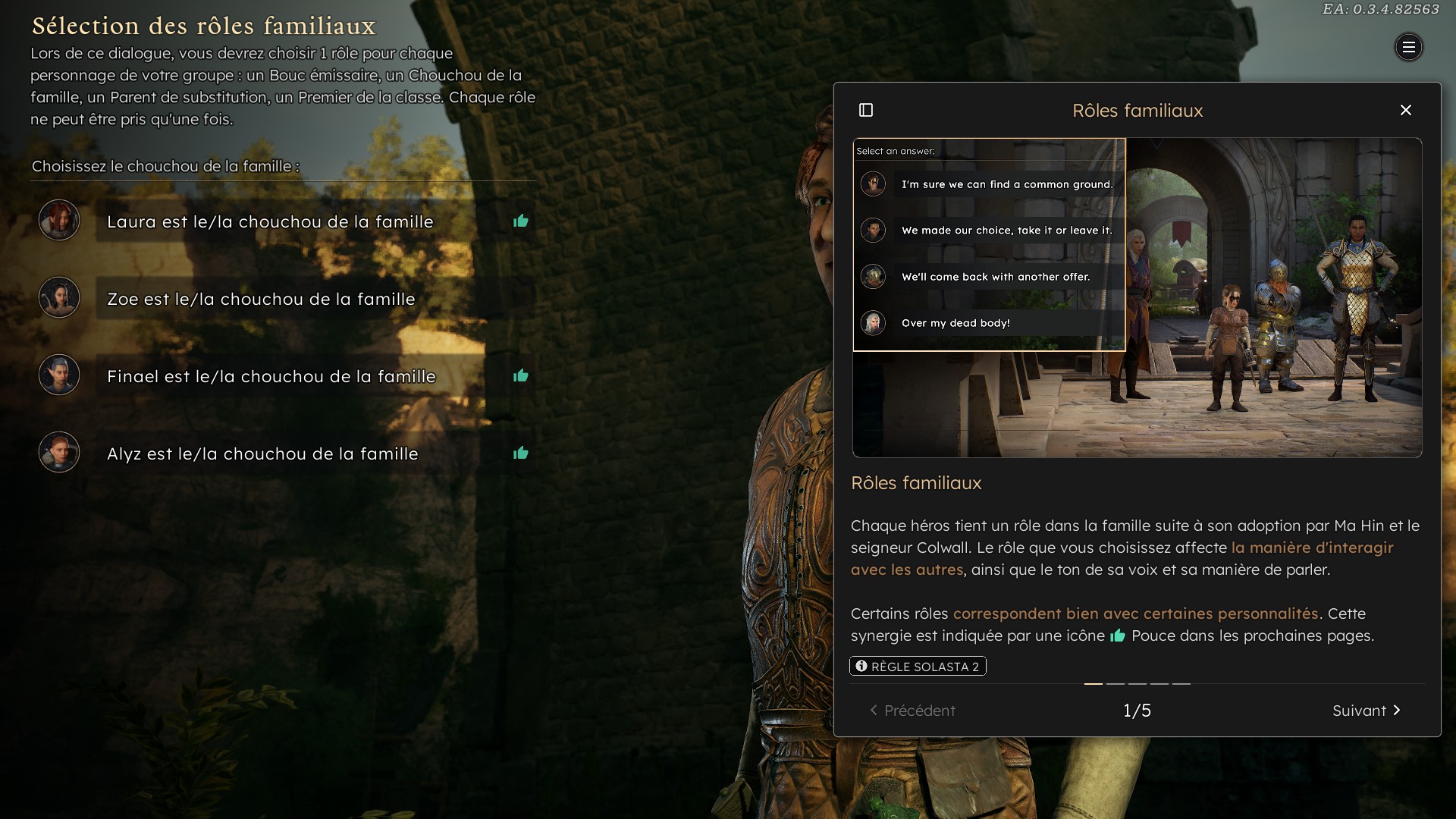 Cette dimension familiale n’est pas anecdotique. Très vite, le jeu nous demande de choisir un rôle qu’occupe chacun des personnages au sein de cette famille, comme chouchou ou parent de substitution. Un choix qui a un impact dans la manière dont chaque personnage réagit durant les conversations. Le parent de substitution par exemple se montre souvent plus diplomate. C’est également là que le jeu se différencie le plus d’un Baldur’s Gate 3 (une comparaison à laquelle Solasta n’échappera – malheureusement – pas). Tandis que les personnages du jeu de Larian étaient des individus ayant chacun une personnalité et des motivations propres, notre groupe dans Solasta 2 fait bien ressortir le lien familial qui unit chacun de ses membres, jusque dans les petites piques qu’ils se lancent après un raté en combat.